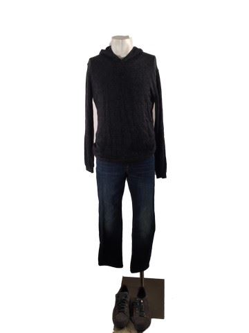 Phil (Adam Devine) screen worn, hero, black hooded "John Varvatos" 1 front pocket sweater (M), olive green "American Apparel" crew neck t-shirt (L), denim 4 hole button fly "All Saints" slim leg 5 pocket jeans (36), grey suede "Gianvito Rossi" low top sneakers with 6 hole lace up and grey soles (42.5). worn in scene 12. Wardrobe tag included.