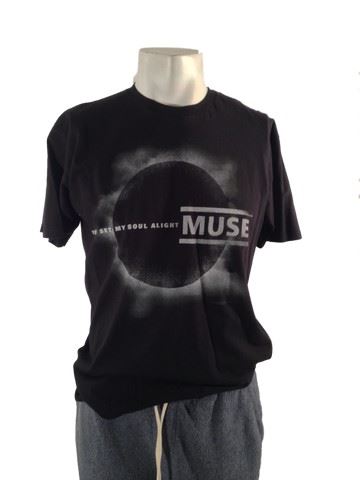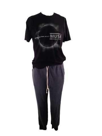 Phil ( Adam Devine) screen worn, hero, black "Muse" concert t- shirt, blue fleece jogger "Alternative" pant (M). Worn in scene 4. Wardrobe tag included.