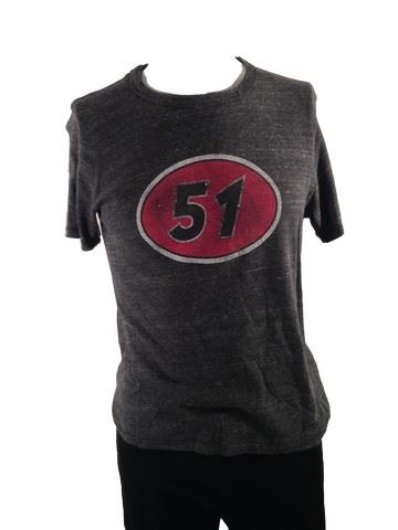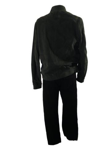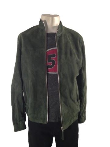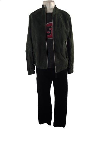 Phil ( Adam Devine) screen worn, hero, hunter green suede "Theory" bomber jacket with standing collar and elastic sleeves (M), grey "Alternative" crew neck with red oval "51" graphic (L), black "Frame" denim 5 pocket slim cut jeans (33). Worn in scenes 71-85. Wardrobe tag included.