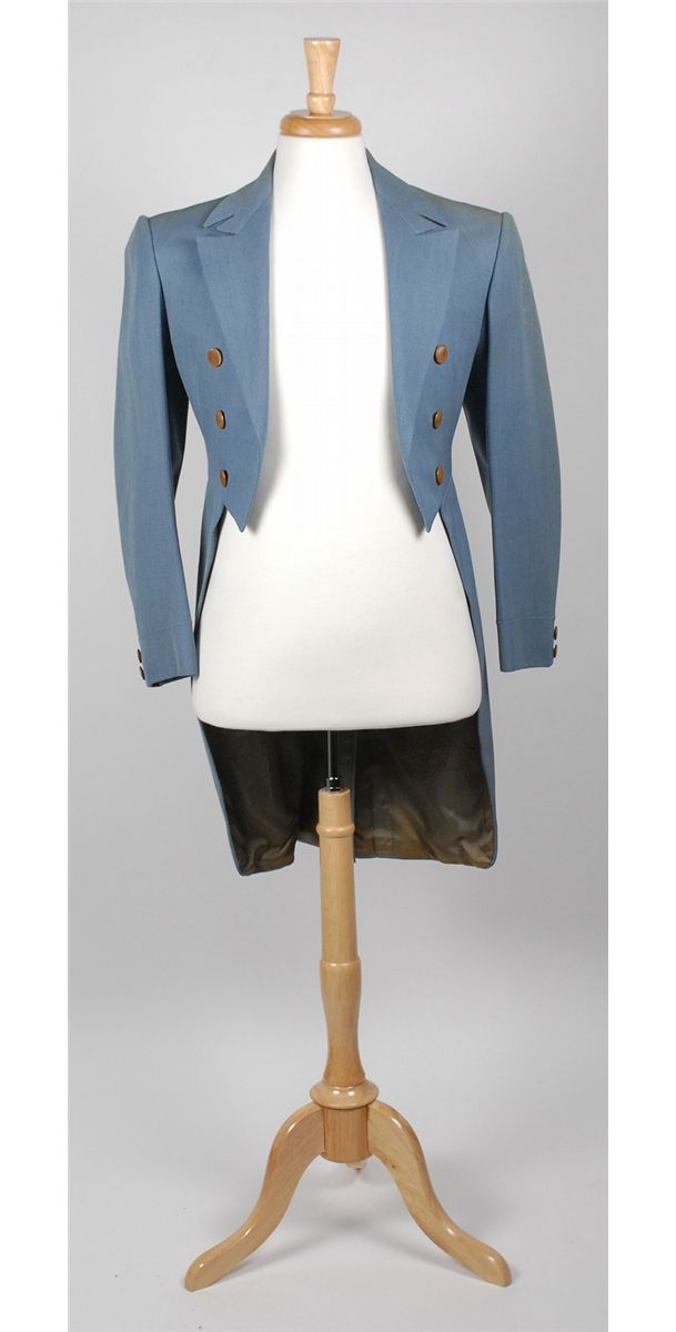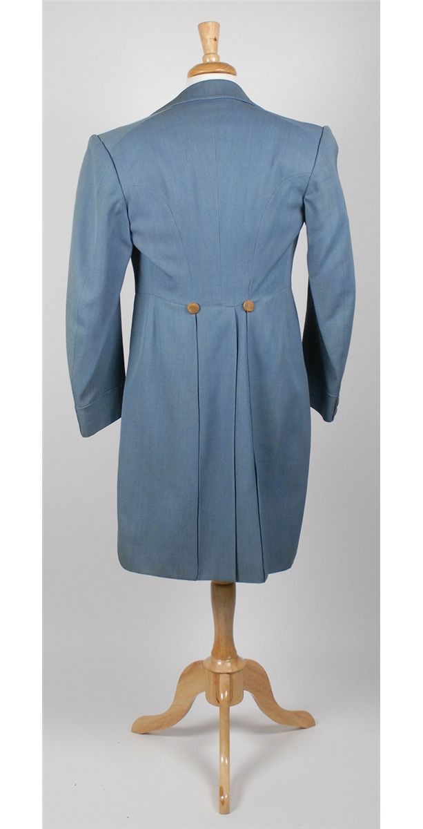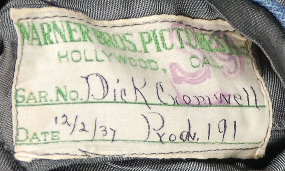 Victorian-style tailcoat worn by Cromwell in the 1938 film Jezebel. Light blue wool coat features two rows of buttons and a Warner Bros. Pictures, Inc. costume label sewn into the inside breast pocket, with Cromwell’s name written on the first line, and “12/2/37 Prod. 191,” written on the second line. In fine condition, with some light fading to one shoulder and collar.