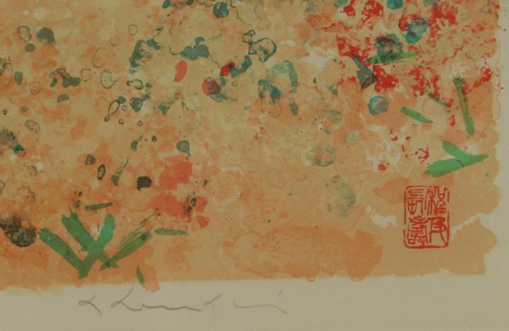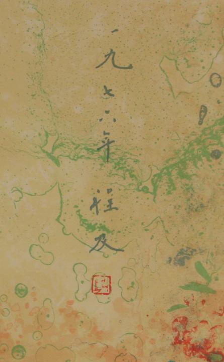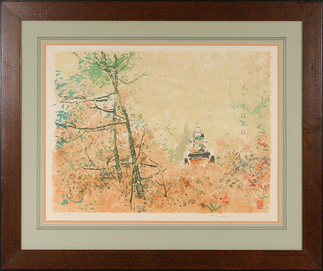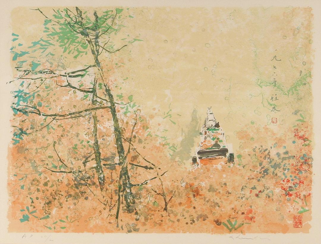 Ji Cheng (20th century), Chinese Silkscreen, image size 18" x 24", AP 45/60, pencil signed, markings & seal in image. The written characters read from the top down as a date for the 'year of 1976' followed by two characters which apparently form the personal name of 'Cheng (last name meaning 'journey') Ji (first name meaning 'extent of').