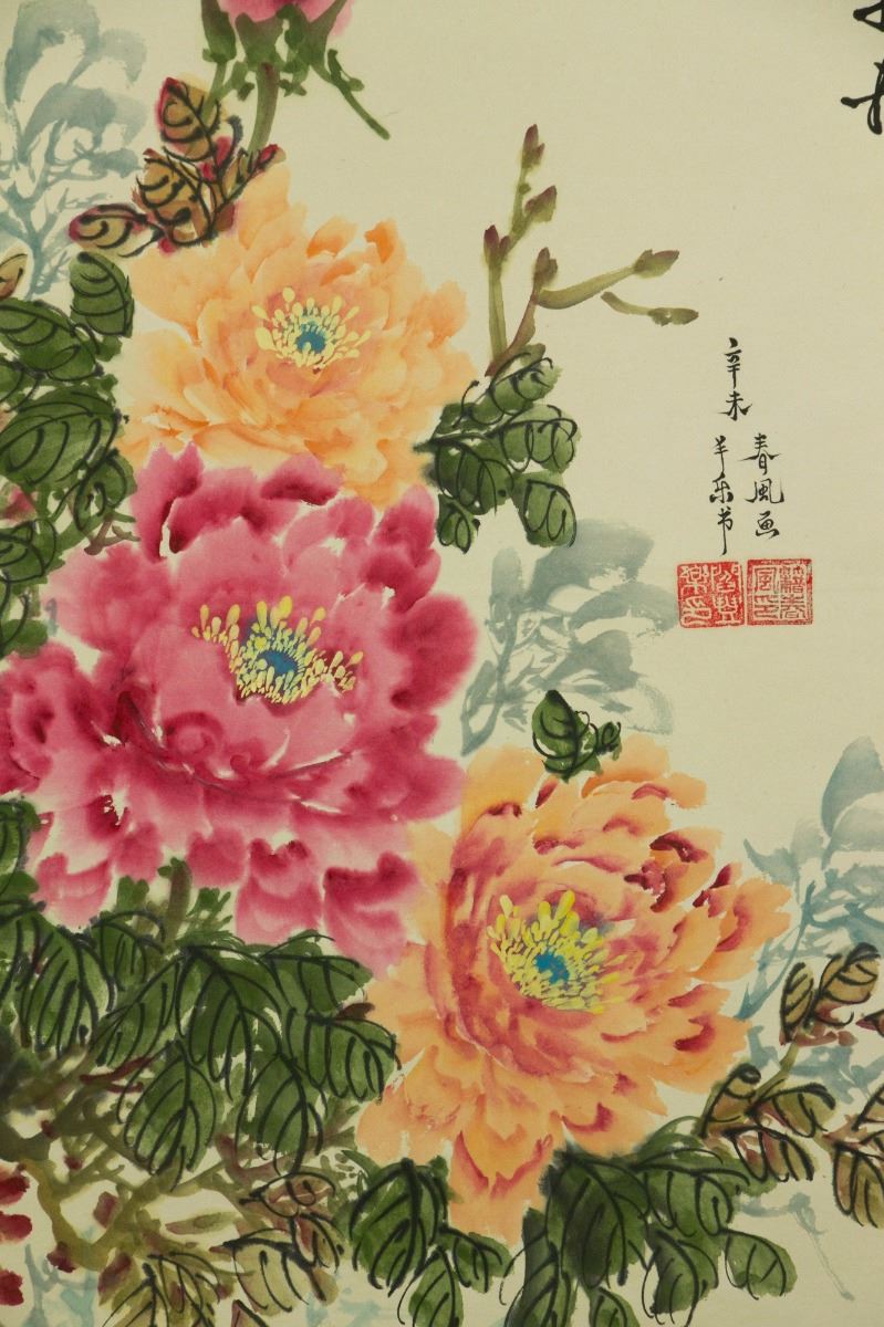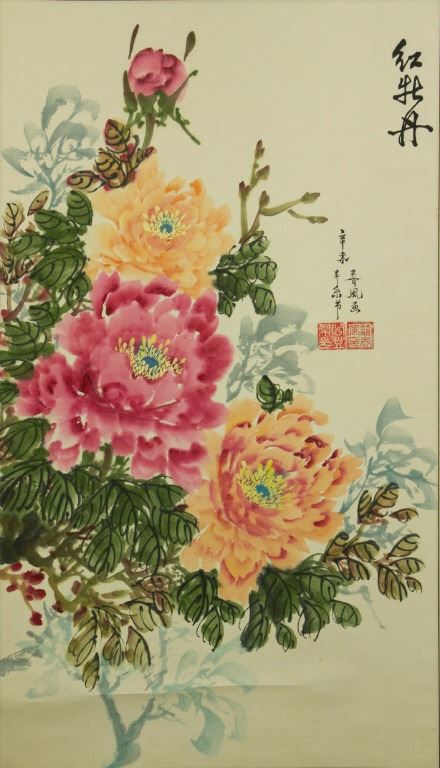Peonies; Chinese ink and watercolour on paper; hanging scroll; signed Ji Chenfeng and inscribed with one artist seal; titled by Ni Fengle and inscribed with one seal; 37 cm × 26 cm