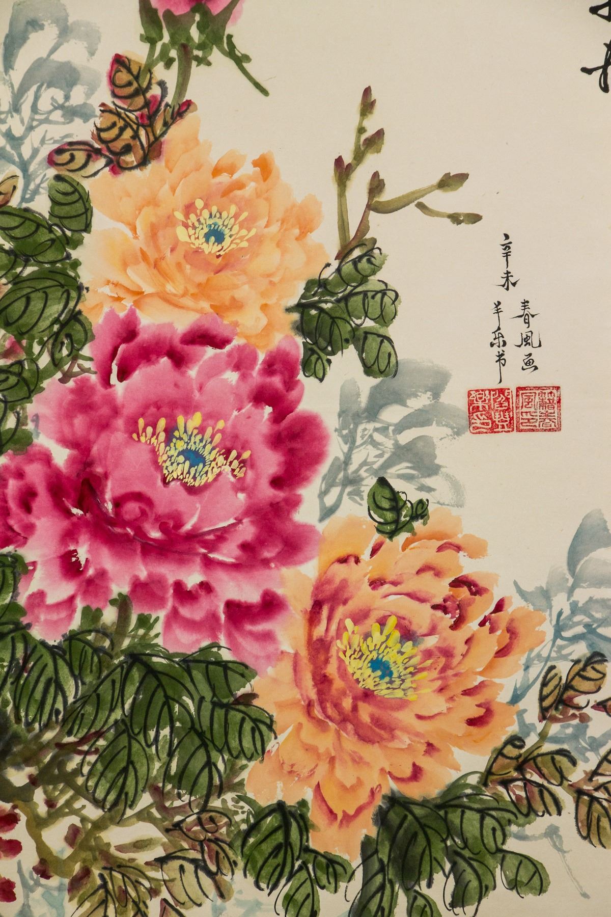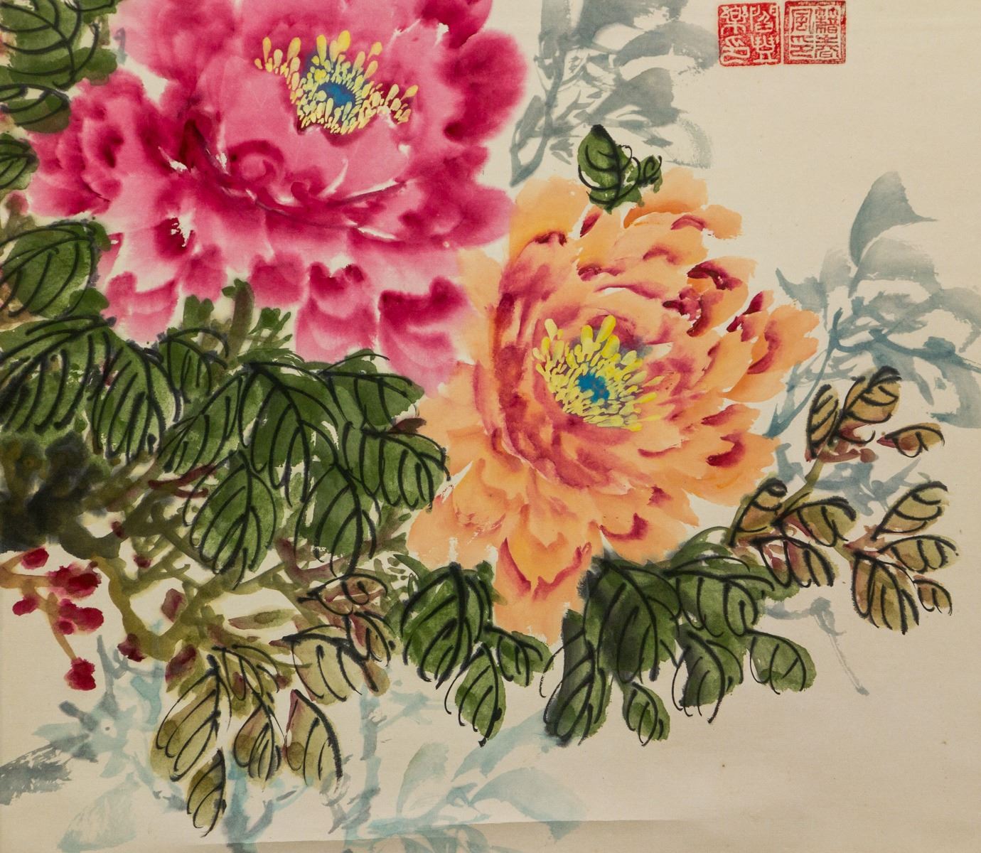 Ink and watercolor on paper, hanging scroll. Featuring peony. Signed Ji Chenfeng, inscribed with one artist seal. Titled by Yan Fengle b. 1933 and inscribed with one seal. 37 × 26 cm