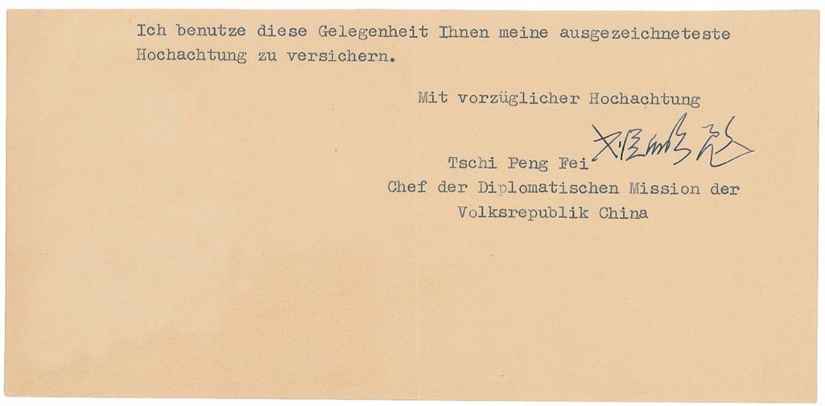 Chinese politician (1910–2000) who, at the age of 43, became the youngest Chinese ambassado,; serving as his country’s first representative to the German Democratic Republic. TNS in German and signed in Chinese as ambassador to Germany, 6.25 x 5, clipped from the closing of a longer letter. In full (translated): “I take this opportunity to assure you of my most distinguished consideration.” In fine condition, with central vertical fold and show-through from mounting remnants on reverse (not near signature).