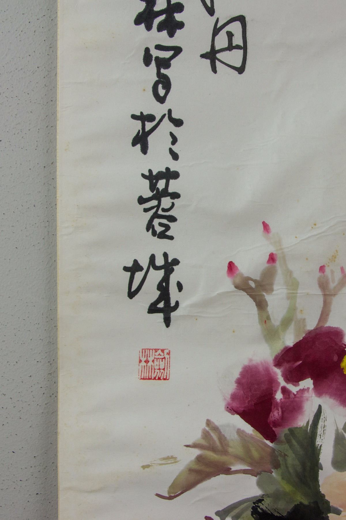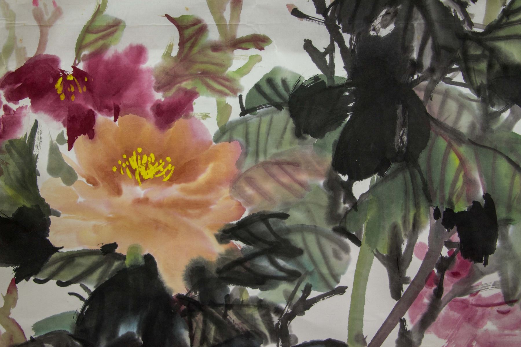 Painting of peony flowers; Chinese ink and watercolour on paper; signed Jian Lin, with 1 artist seal; 94.8 cm x 60 cm