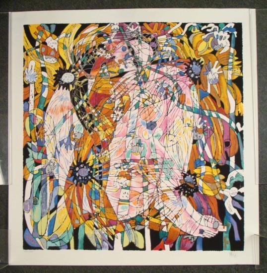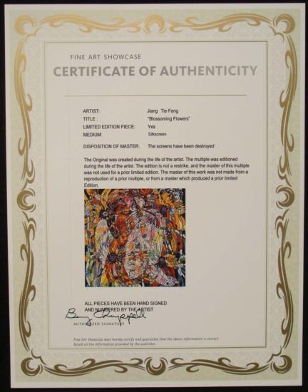 This is a print by Chinese Yunnan School artist Jiang Tie Feng. This scene portrays flowers in bloom, and a figure reclining. There is an abundance of intersecting lines, obscuring some of the flowers, and making everything look a little like stained glass, especially with the bright colors. Artist: Jiang Tie Feng Title: "Blossoming Flowers" Medium: Silkscreen on paper Signature: Signed by the artist in pencil, lower right Edition: Artist's proof, numbered 18/75 in pencil, lower left; Deluxe Edition, original plates have been destroyed Publisher: Fingerhut Sheet size: 43 x 44 inches Condition: Very good; some light creasing at the top edges, and minor tear under signature- readily matted out; has been stored rolled Certificate of Authenticity: From Fine Art Showcase This is a vivid and wonderful Tie Feng that you can just get lost in. Biography: