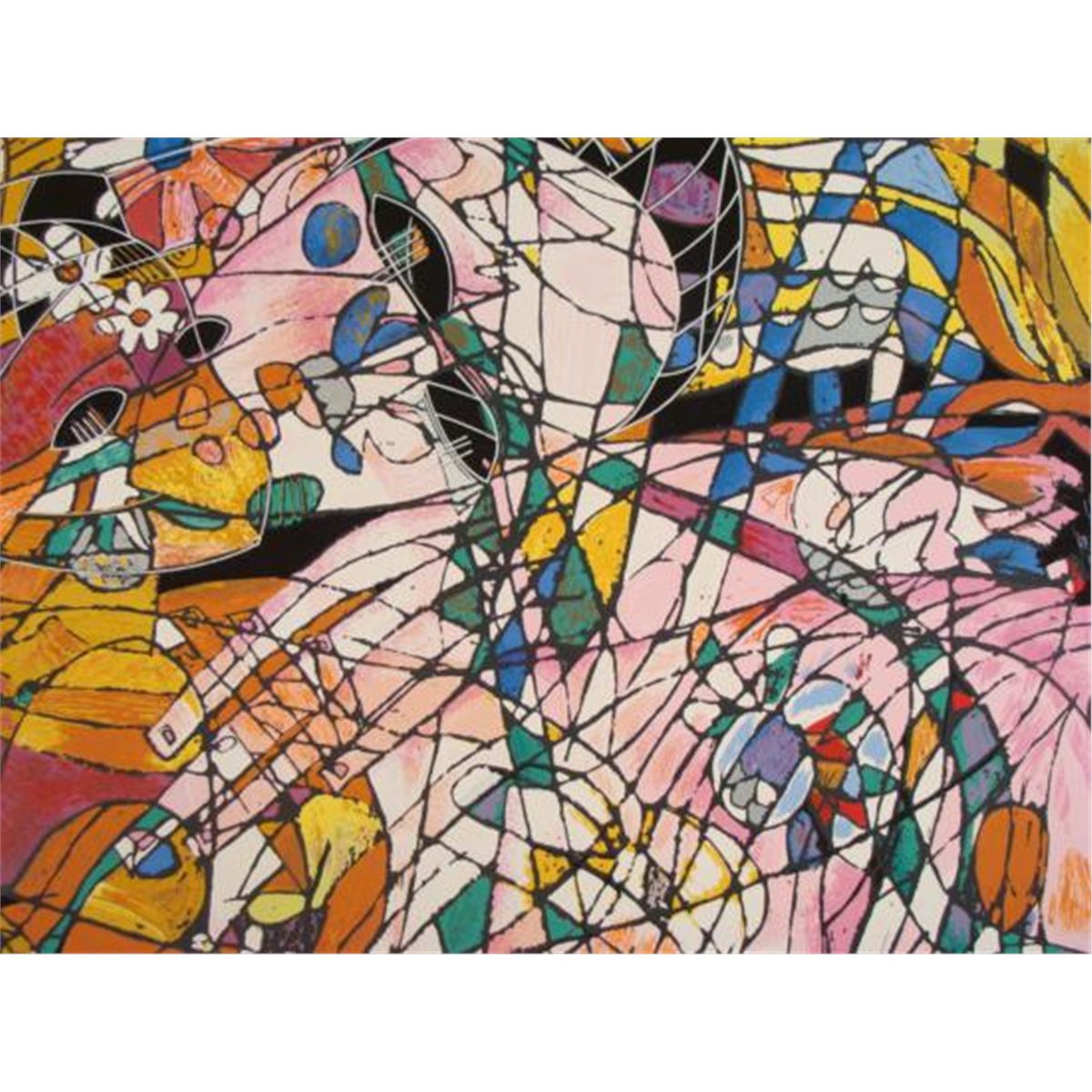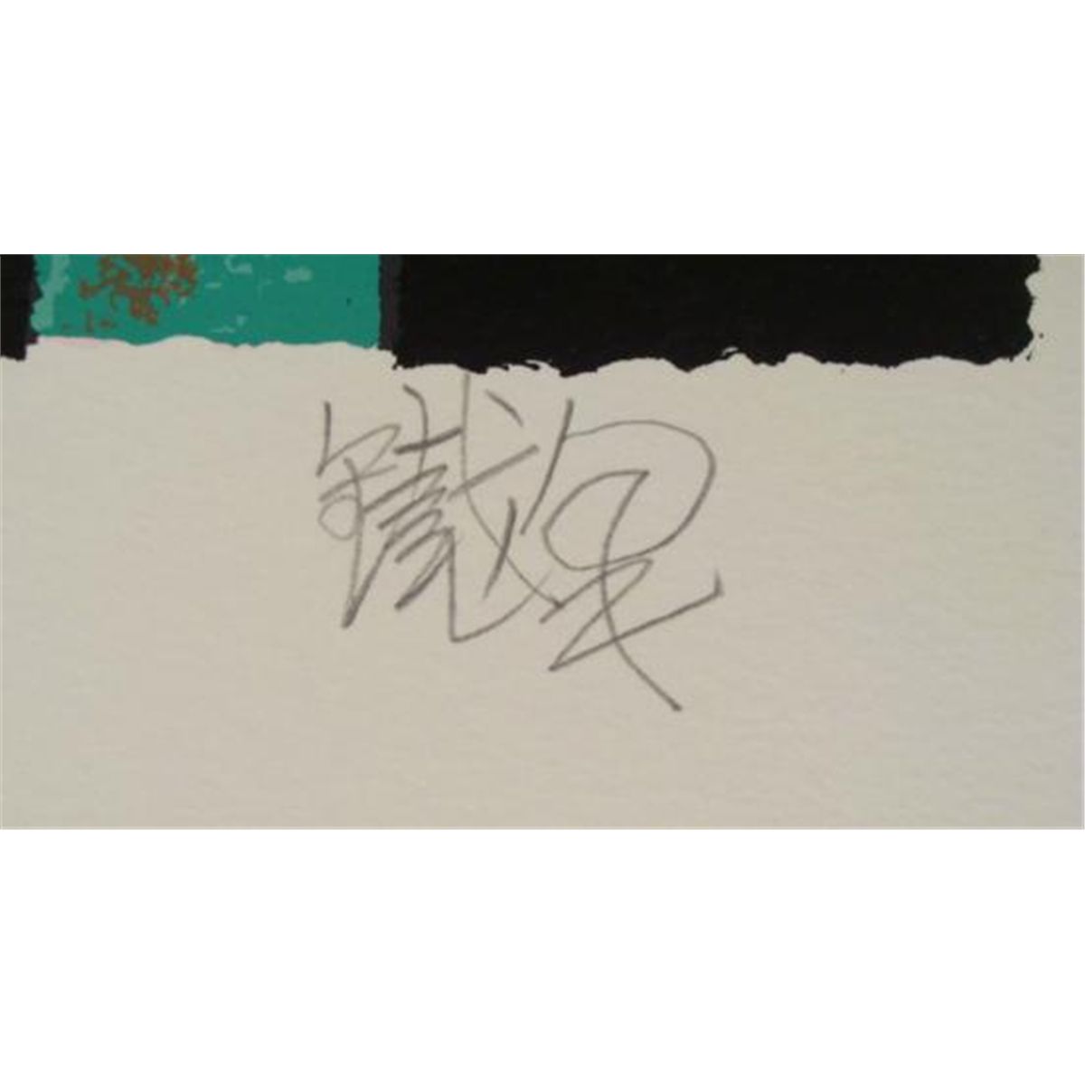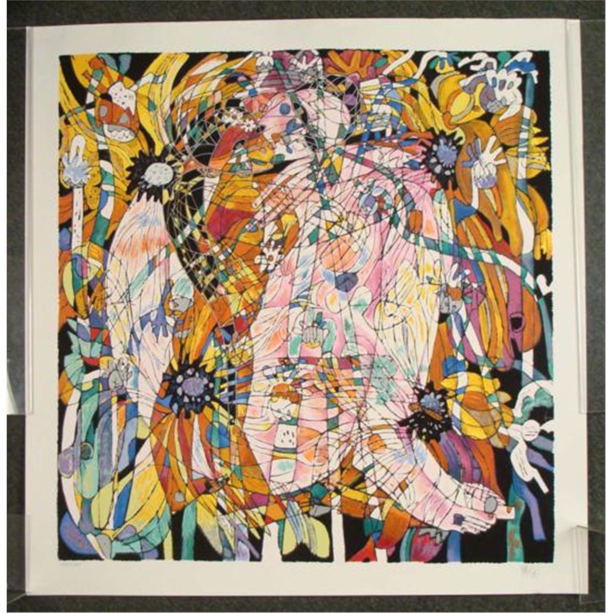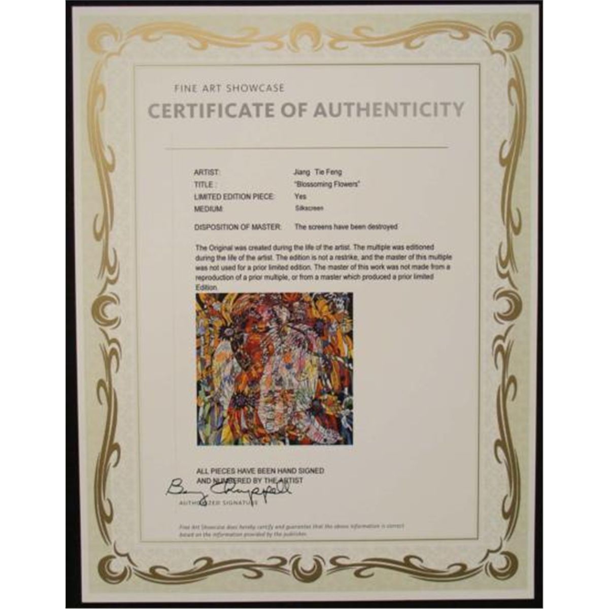 This is a print by Chinese Yunnan School artist Jiang Tie Feng. This scene portrays flowers in bloom, and a figure reclining. There is an abundance of intersecting lines, obscuring some of the flowers, and making everything look a little like stained glass, especially with the bright colors. Artist: Jiang Tie Feng Title: "Blossoming Flowers" Medium: Silkscreen on paper Signature: Signed by the artist in pencil, lower right Edition: Artist's proof, numbered 18/75 in pencil, lower left; Deluxe Edition, original plates have been destroyed Publisher: Fingerhut Sheet size: 43 x 44 inches Condition: Very good; some light creasing at the top edges, and minor tear under signature- readily matted out; has been stored rolled Certificate of Authenticity: From Fine Art Showcase This is a vivid and wonderful Tie Feng that you can just get lost in. Biography: * Jiang Tie Feng (1938) was born in Ningbo, China. He showed an interest in art as a child, and his mother encouraged his pursuits. He went on to study at the prestigious Central Academy of Fine Arts in Beijing learning from the master artist Huang Yong-yu. He graduated in 1964 at the beginning of the cultural revolution. The Chinese Government hired him to produce"Socialist Realism" propaganda, and one of his posters of a red-faced Chairman Mao became quite famous. The new regime would not allow for his artistic expressions, however, so he and two other artists, He Neng and Liu Shaohui, Jiang formed a school that became known as the "Yunnan School." In 1983, Jiang came to the US and began teaching art at the University of Southern California, in their cultural exchange program. His art was noticed by American galleries, and he became quite popular. His paintings are full of Buddhist and Chinese mythology. What most people saw, however, were his revolutions forms and colors, which broke from traditional Chinese painting. He has said "my work is my understanding of life." He eventually settled in California, and he has become known as the Father of the Yunnan School of Art. His work has appeared at many group and one man exhibitions, and is widely collected throughout the world. *