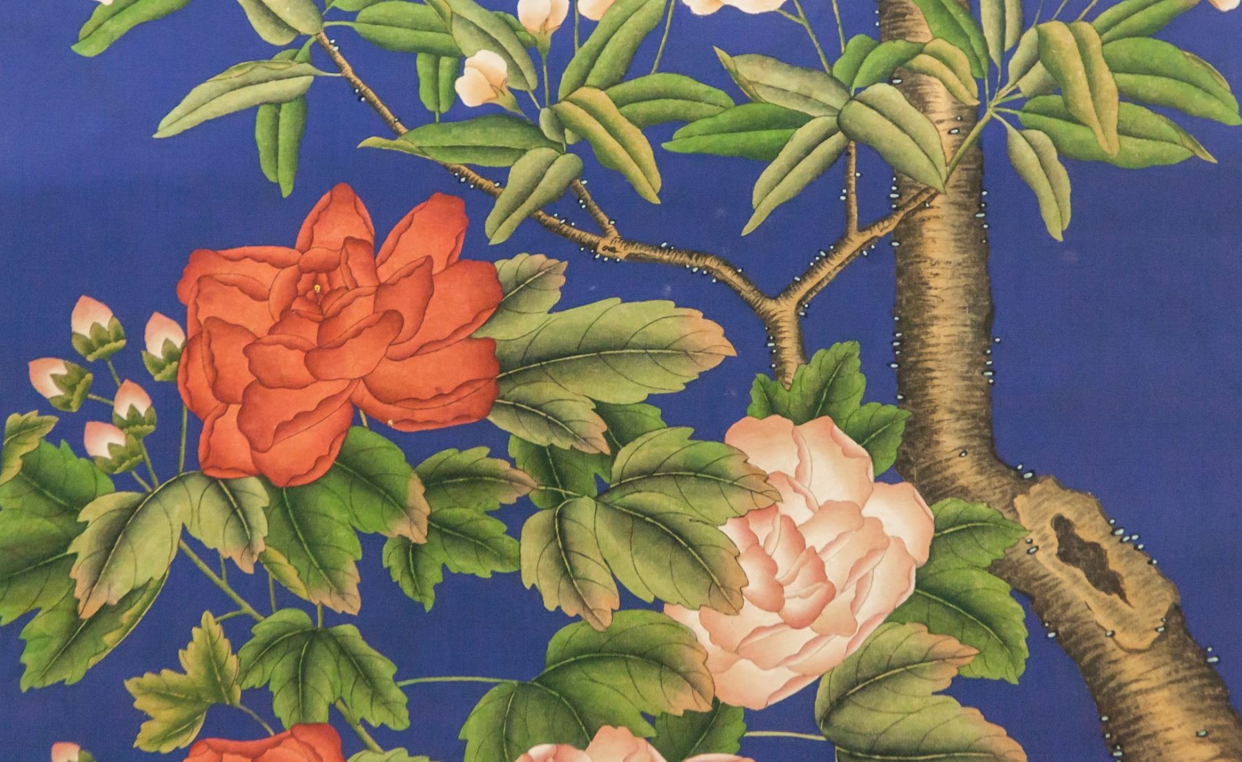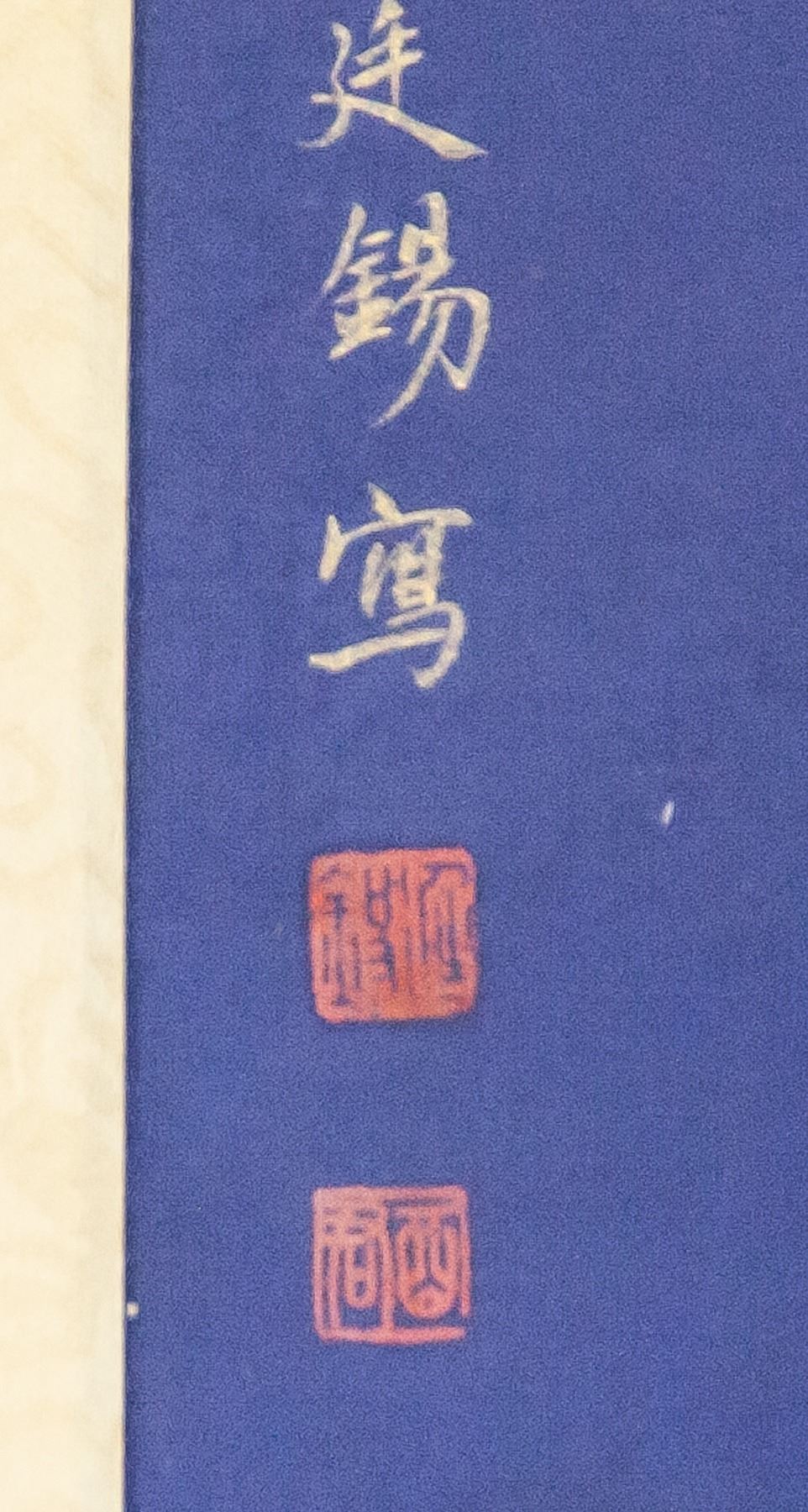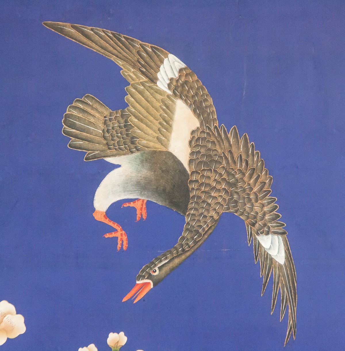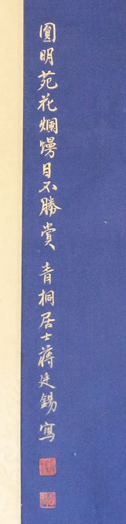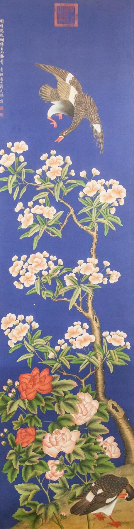 Ink and watercolor on paper, hanging scroll. Featuring goose and flowers. Signed Jiang Tingxi (1669-1732, Chinese), inscribed with 2 artist seals and 1 collector seal. 172 x 45 cm