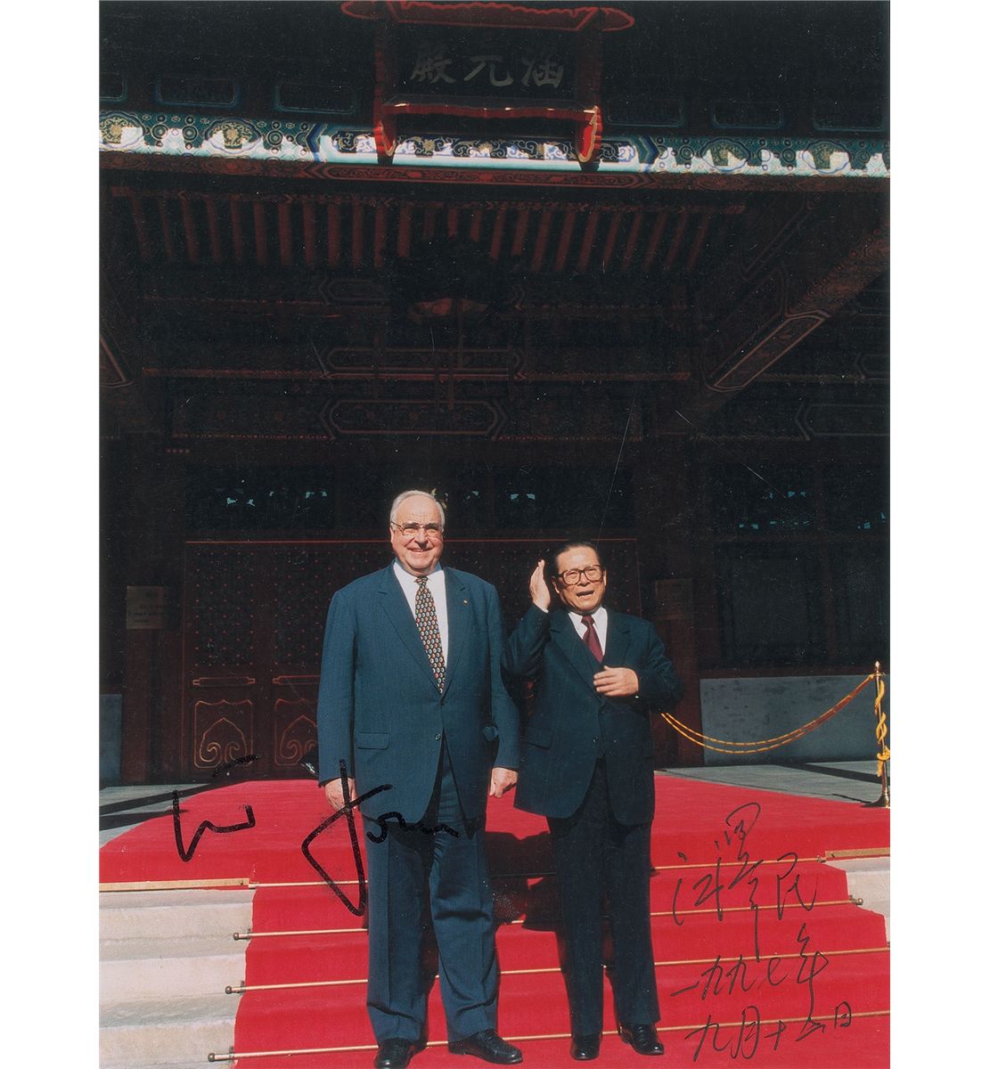 High-quality color glossy 7 x 9.5 official German press photo of Kohl visiting the PROC in November of 1995, signed in black ink by Jiang Zemin (fifth president of the PROC from 1993–2003) in Chinese and by German Chancellor Helmut Kohl in black felt tip. Information on the reverse reads, in part: “[Kohl’s] conversation with China’s president Jiang Zhemin and Prime Minister Li Peng focused on reformatory politics and the economic opening as well as questions of human rights and the improvement of bilateral relations of both cultures.” In fine condition, with a slight crease to upper left corner and slight brushing to Kohl’s signature; Jiang’s autograph remains pristine. Under Jiang’s direction, China experienced significant developmental growth, though he was belittled by some for his eagerness to obtain approval from the outside world—a point fittingly pictured in this remarkable dual-signed photograph.