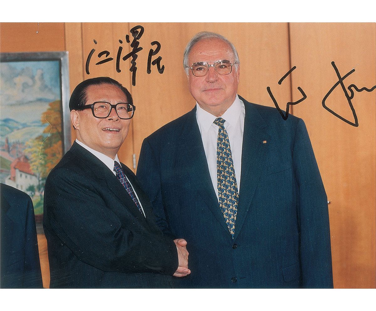 Chinese politician (born 1926) who served as president of the People's Republic of China from 1993 to 2003, overseeing substantial economic development and reforms. Color glossy 7 x 5 photo of Jiang Zemin and Helmut Kohl, signed in black felt tip by both world leaders. In fine condition. Accompanied by a letter of transmittal from the Chinese ministry of foreign affairs, dated 1996, and the original address panel from the mailing envelope.