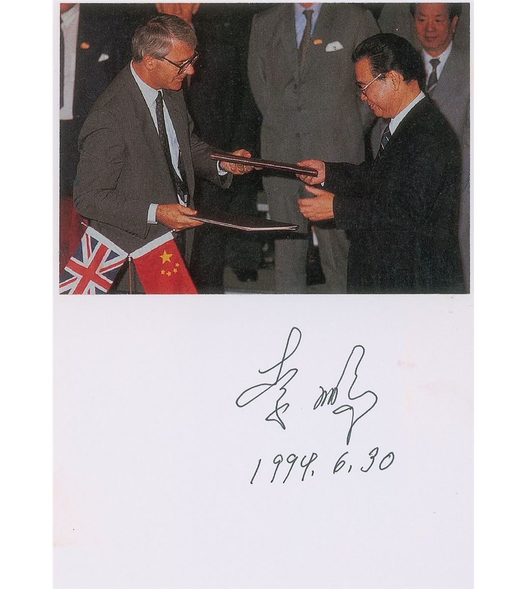 Chinese politician (born 1926) who served as president of the People's Republic of China from 1993 to 2003, overseeing substantial economic development and reforms. Ink signature in Chinese, dated June 30, 1994, on a white 4 x 5.75 card with a clipped photo of Zemin and John Major affixed to top portion of the card. In fine condition, with one corner of photo peeling from card.