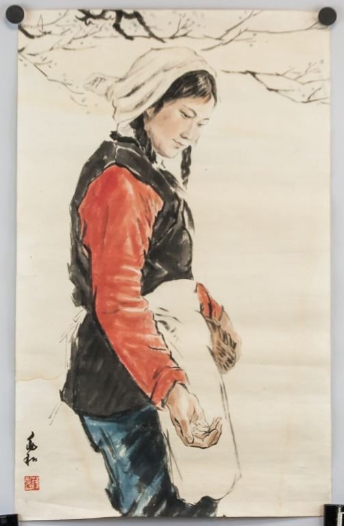 Ink and watercolor on paper. Featuring potrait of lady. Signed Jiang Zhaohe (1904-1986, Chinese), inscribed with 1 artist seal. 66 x 41 cm