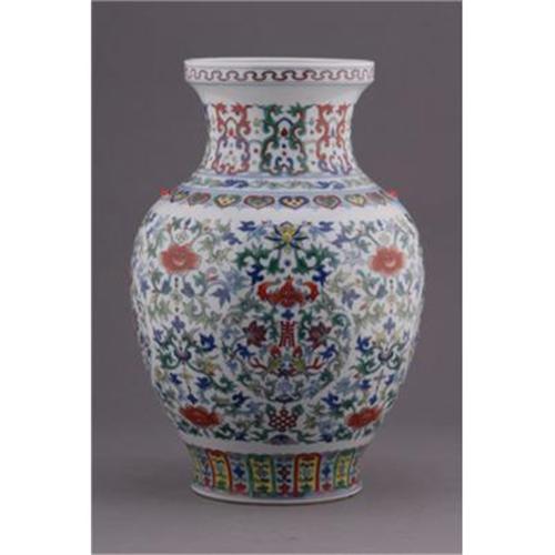 This beautiful procelain vase is decorated in "separated colors" (Doucai): first with underglaze blue and then with overglaze red, yellow and green. Two small ears are missing(see photographs). Marked and of Jiaqing period(1796-1820 ). Height 15 3/8"; Mouth 6 11/16"; Bottom 6".