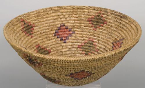 Jicarilla Apache Basket. 6" x 15”. Bowl shape. Brightly colored diamond designs. Strong contrast colors. Good condition. c. 1940-50. (est $600-800)