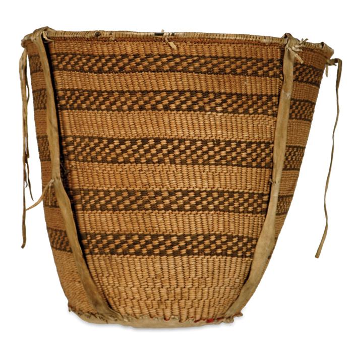 Jicarilla Apache Burden Basket. 15" tall, 16" diameter. Checkerboard band designs. Leather straps and fringed suspension. 19th century. (est $2,000-2,500)