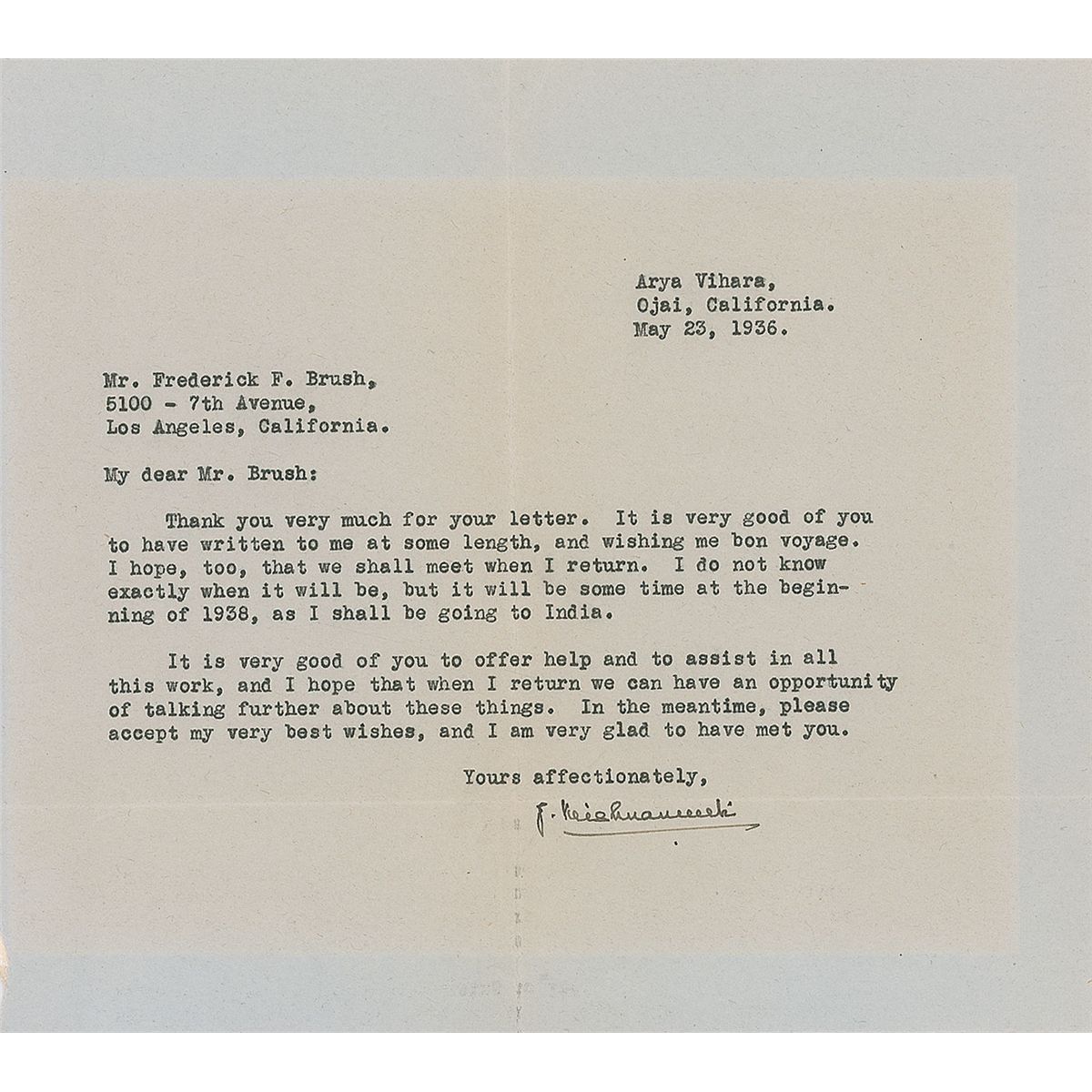 Indian speaker and writer on philosophical and spiritual themes (1895–1986), including meditation, the nature of mind, and psychological revolution. Scarce TLS, one page, 7.75 x 7, May 23, 1936. Letter to Frederick F. Brush, in part: “It is very good of you to have written to me at some length, and wishing me bon voyage. I hope, too, that we shall meet when I return. I do not know exactly when it will be, but it will be some time at the beginning of 1938, as I shall be going to India.” Trimmed and affixed to a same-size mount. In fine condition, with vertical and horizontal folds (not affecting the signature), a subtle overall block of toning from previous display, and a small area of paper loss to lower left edge. Accompanied by the original mailing envelope.