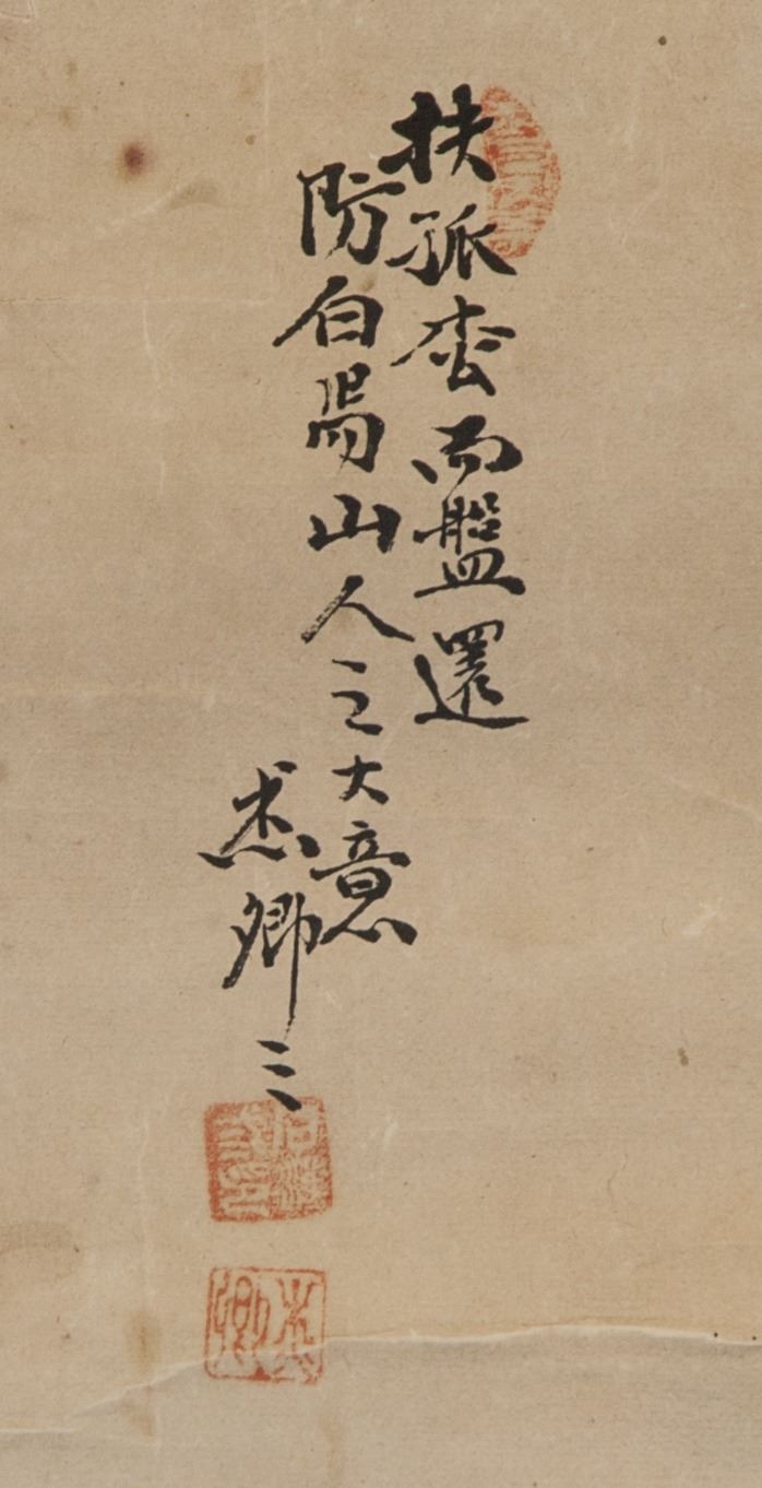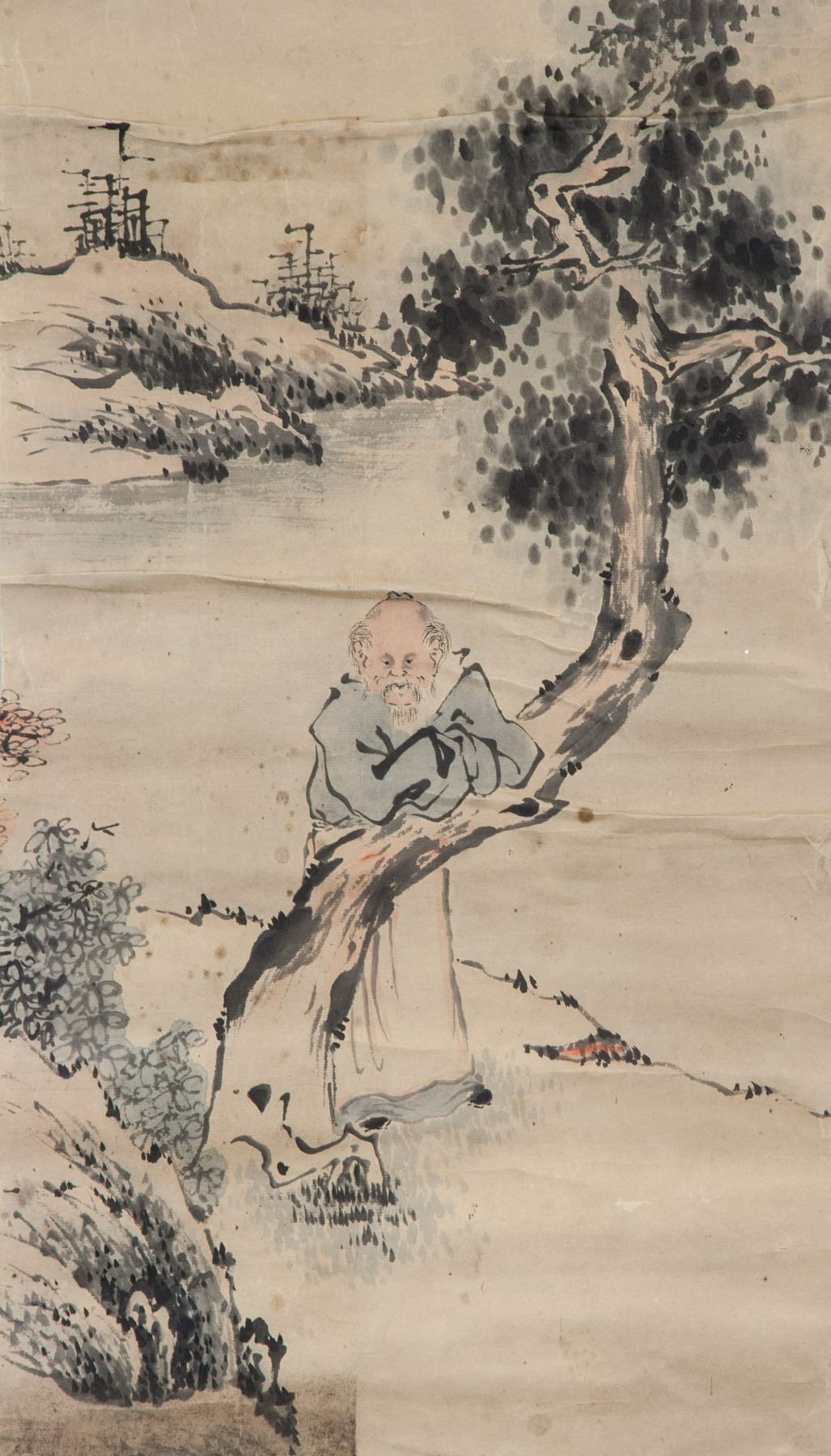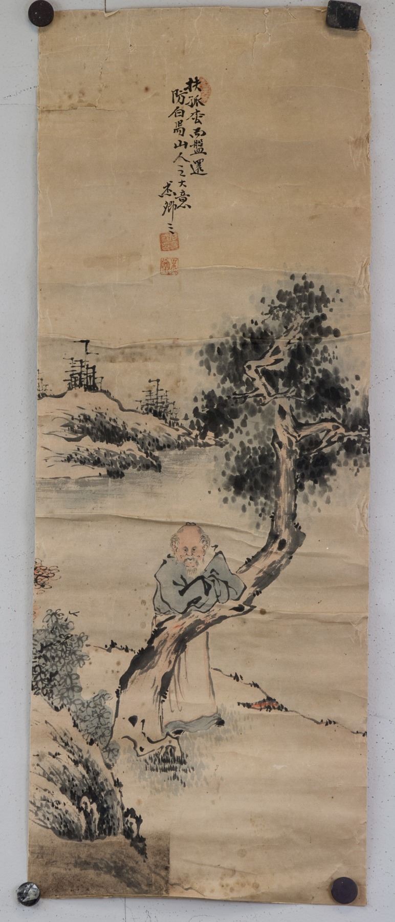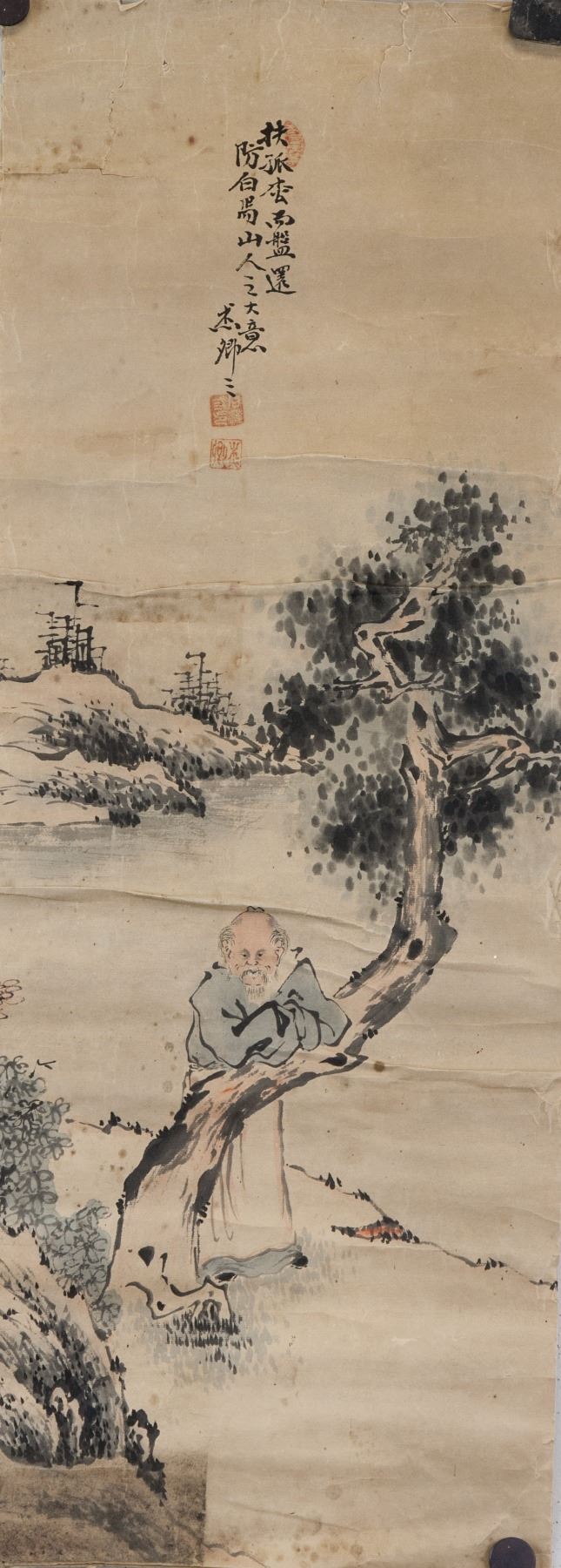 Paining of old hermit; Chinese ink and watercolour on paper; signed Jie Qing; inscribed with 3 artist seals; 16th-18th century; 65 cm x 25 cm; Poor condition; water damage marks, fold marks, torn edges;
