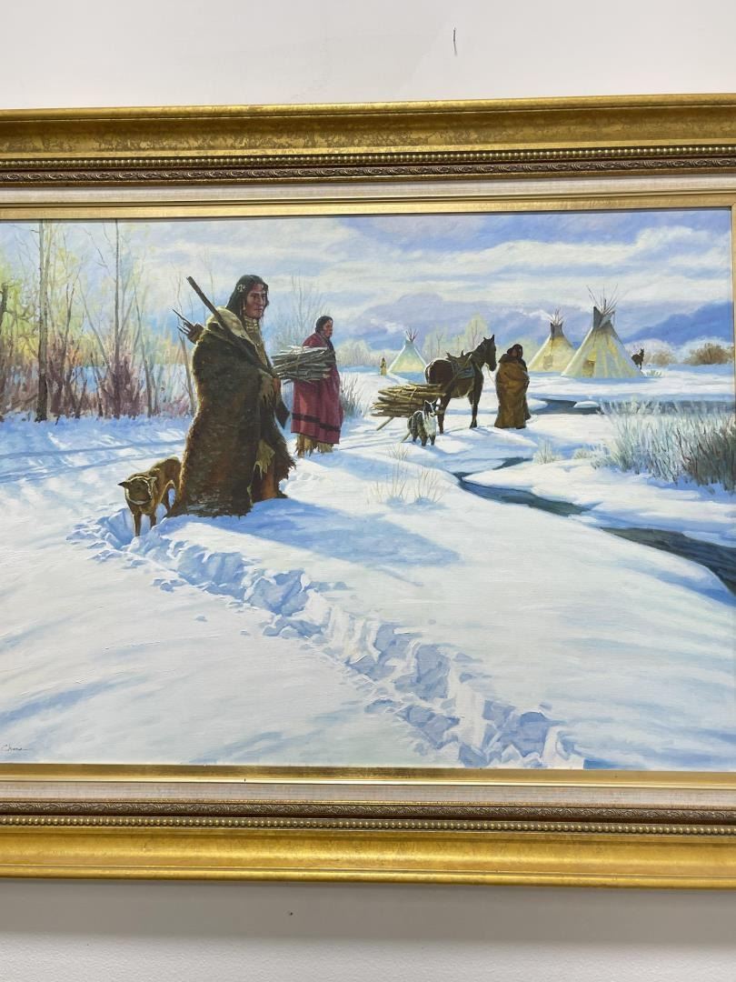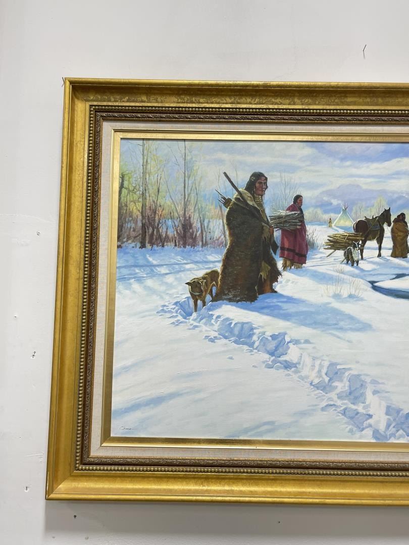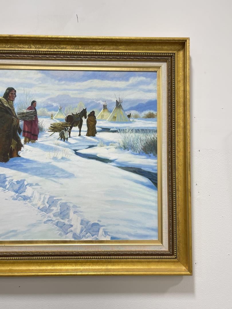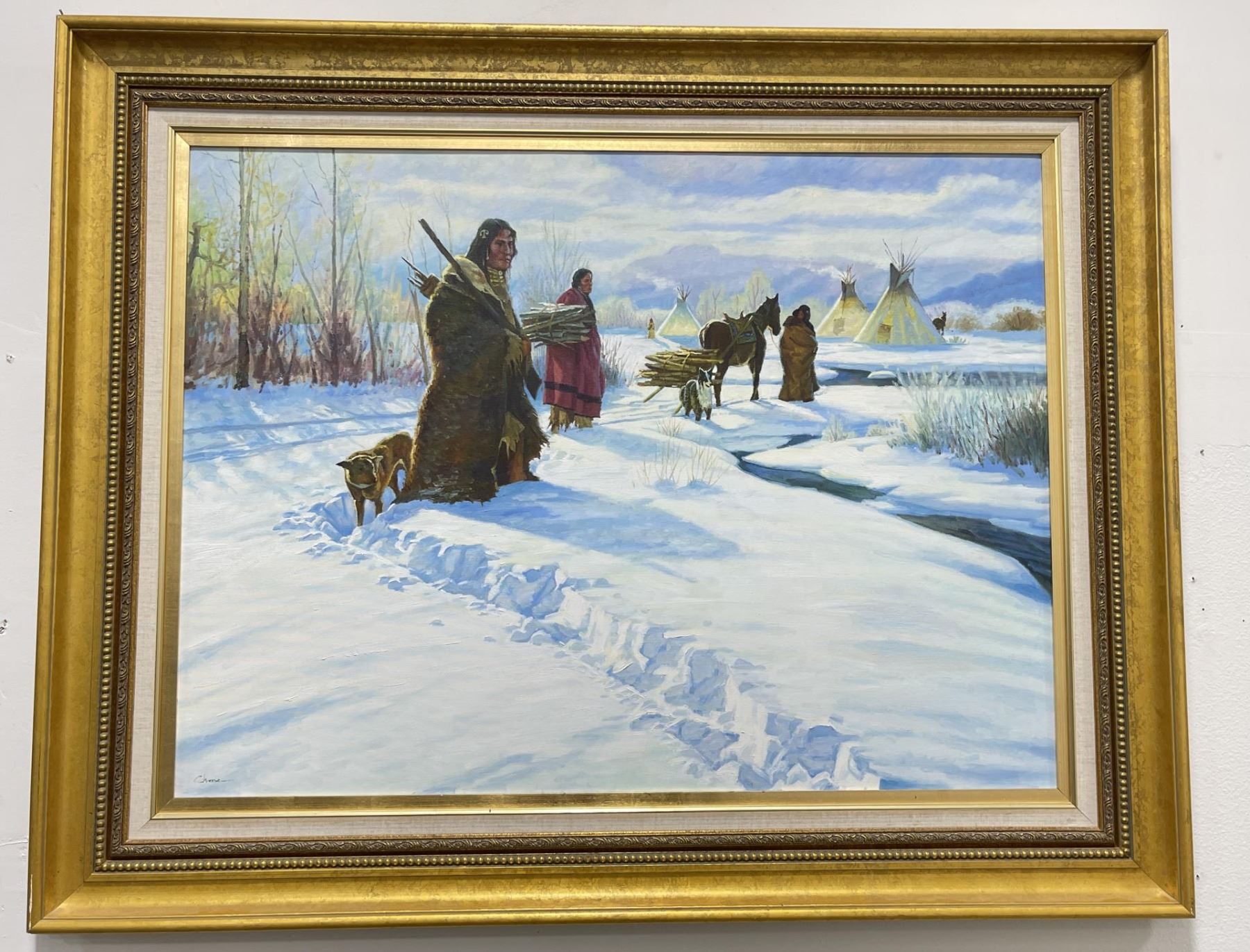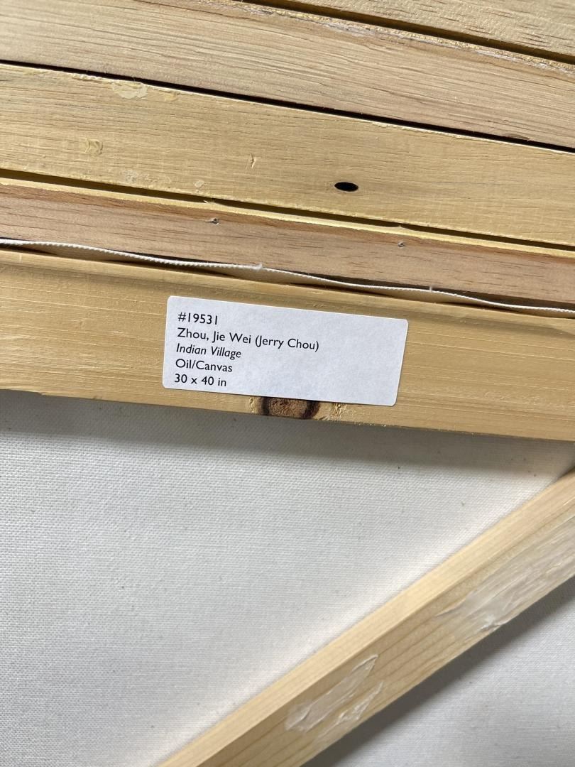 40 1/2" by 51" framed. 30" by 40" unframed. Has restoration in the lower right of the canvas. Patch as shown. Jie Wei Zhou (Born 1962) is active/lives in New Mexico / China. Jie Wei Zhou is known for Impressionist landscape, Asian figure, and portrait painting. A master realist who was born in China and earned a Bachelor of Arts degree from Shanghai Normal University, Jie Wei Zhou earned his passage to the United States by sending paintings to a gallery in the U.S. and saving the proceeds from his sales. Now a US resident, Zhou paints pictures of Tibetans, Mongolians and Chinese. Jerry Chou is the pseudo name for Jie Wei Zhou used early in his career.