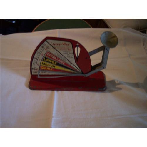 These are such a darling collection for a kitchen.Especially with an egg sitting on the one end.I have two I am listing.This is a "Jiffy-Way" scale and great for the collector of red items.Some paint wear on the base but the writing is good.