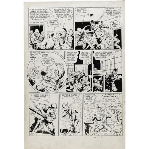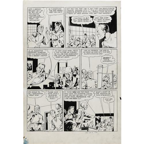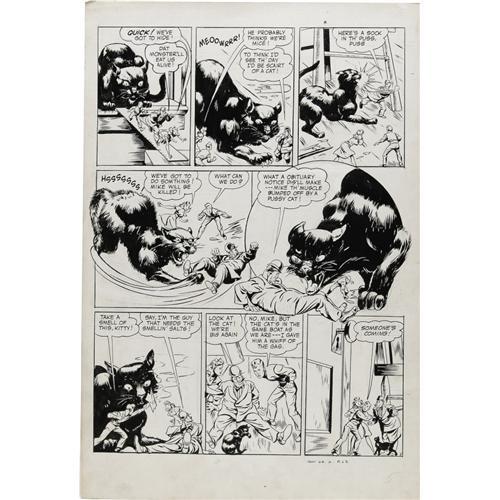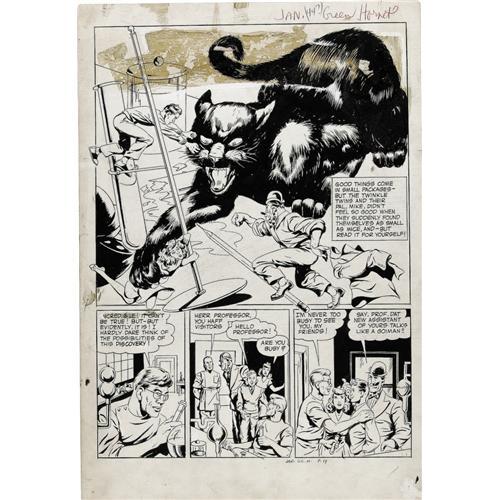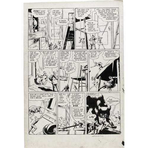 <B>Jill Elgin (attributed) - Green Hornet #16 Complete 8-page Twinkle Twins Story "The Shrinking Gas" Original Art (Harvey, 1944).</B></I> This story's ferocious feline splash is a real grabber. The Twinkle Twins and Mike play "Land of the Giants" in this eight-page thriller. The image area of each page measures 12.5" x 18". Page one is missing its title logo stat; otherwise the art is in Very Good condition.