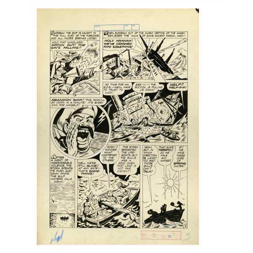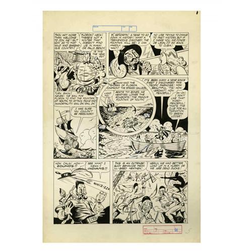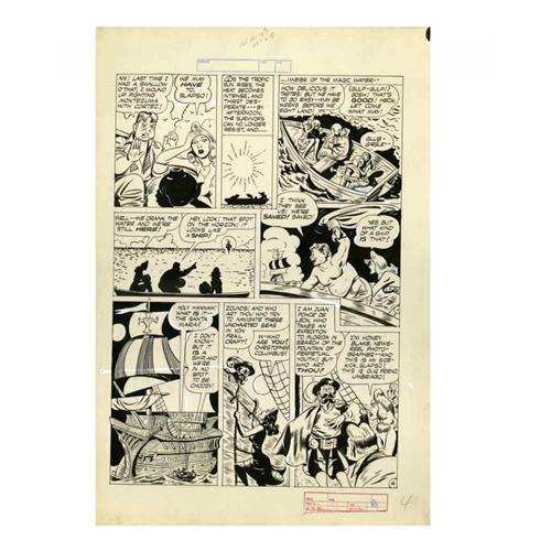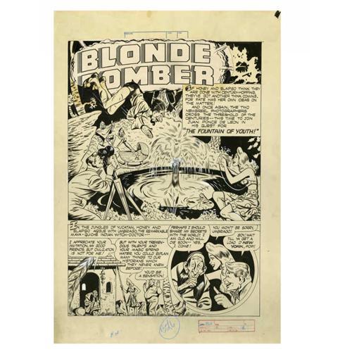 <B>Jill Elgin - Unpublished Complete 8-page Blonde Bomber Story "Fountain of Youth" Original Art (Harvey, circa 1945).</B></I> Lack of issue title or date production notes on this eight page romp may indicate that it never saw print. The Blonde Bomber and Slapso survive a shipwreck at sea, only to be transported through time where they meet the legendary Juan Ponce de Leon. The waters from the fountain of youth play a key role in this wild and wooly yarn and Jill Elgin details the period costumes with a flourish. The image area of each page measures 12.5" x 18," and the art is in Very Good condition.