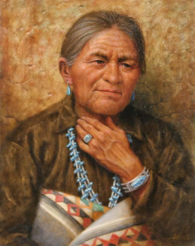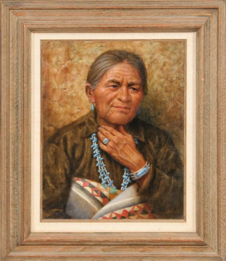 Jim Abeita (b.1947). Thoughts Of The Old Days. 20" x 16" oil on canvas. Signed lower left. (est $800-1,200). Additional Info: Includes Abeita signed note of authenticity dated 1990. For condition reports please visit: www.auctioninsantafe.com/cr2011.pdf