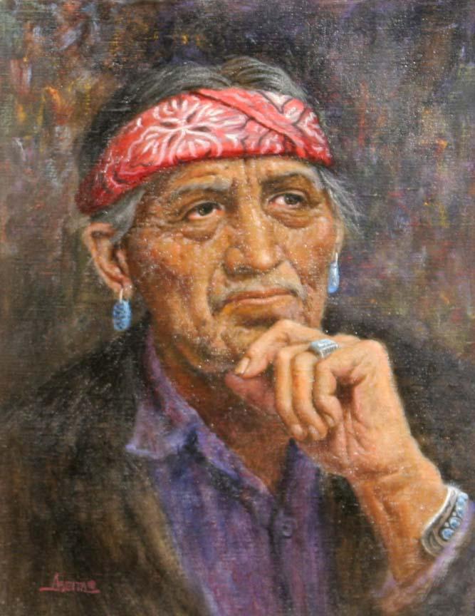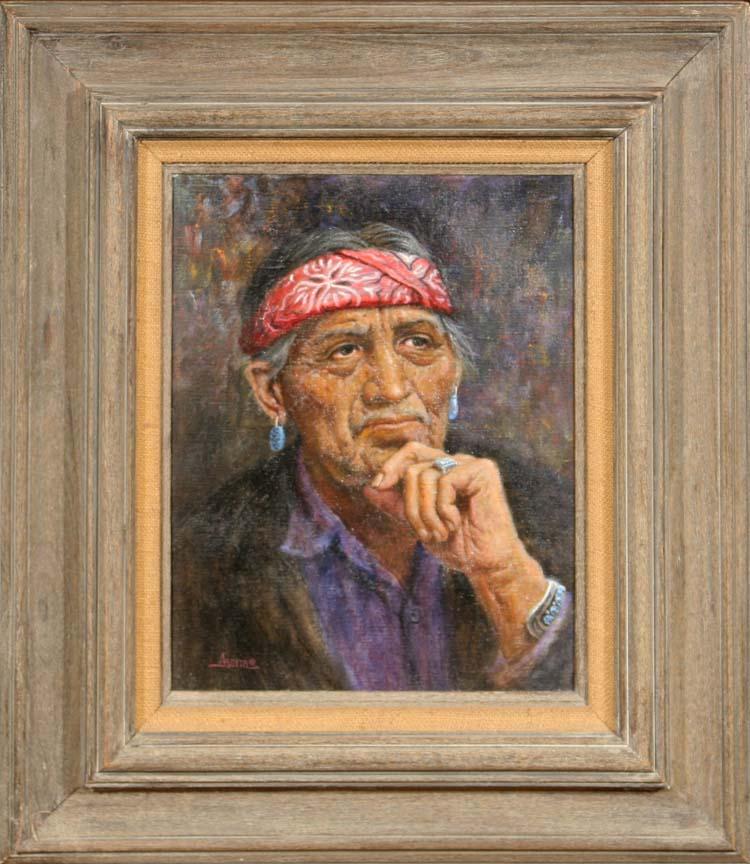 Jim Abeita (b.1947). Tribal Councilman. 18" x 14" oil on canvas. Signed lower left. (est $600-1,000). Additional Info: Includes Abeita signed note of authenticity dated 1990. For condition reports please visit: www.auctioninsantafe.com/cr2011.pdf