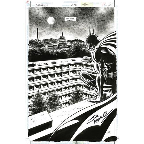 <B>Jim Aparo and David Roach - Batman #560 page 10 Original Art (DC, 1998).</B></I> The Darknight Detective keeps an eye on the capital... from the roof of the Watergate hotel? A stunning image from one of the best Bat-artists ever to pick up a pencil, namely Mr. James Aparo. This exceptionally moody splash page has a great image of Batman, and features detailed inks by David Roach. The image area measures 10.25" x 15.5" and the artwork is in Excellent condition. Signed boldly by Aparo in the lower right corner.