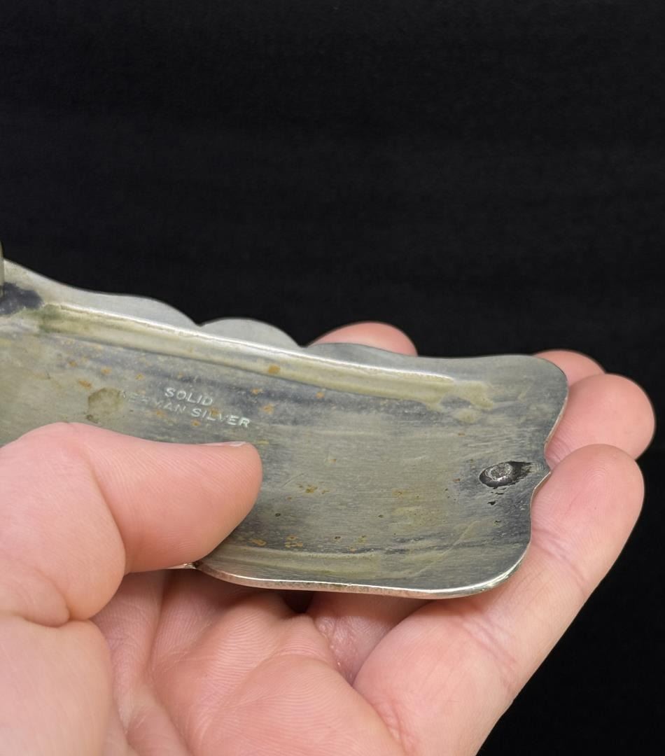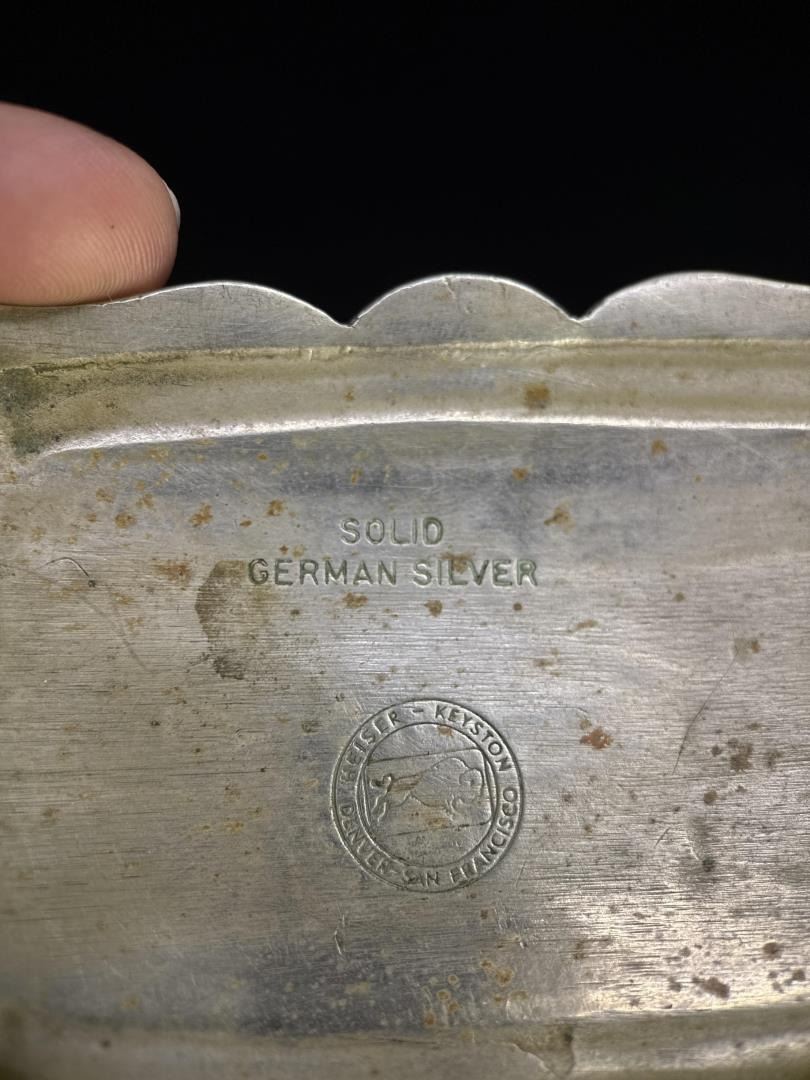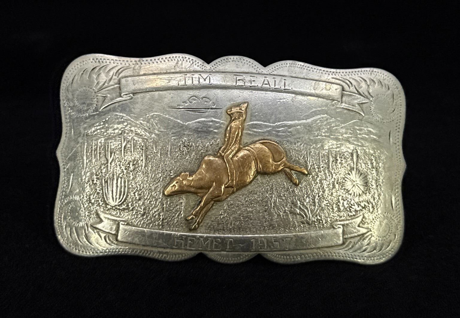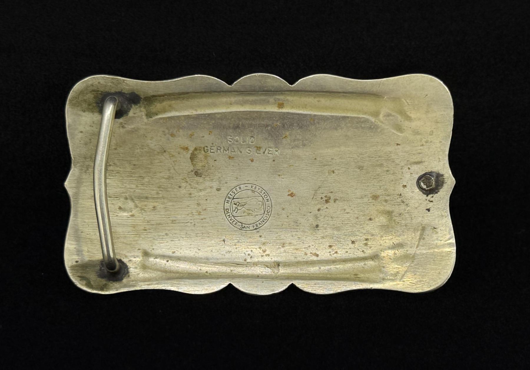 Hemet California 1957. Made by Heiser Keyston Denver San Francisco. Stud is missing on back of buckle. 3 7/8" by 2 1/4".