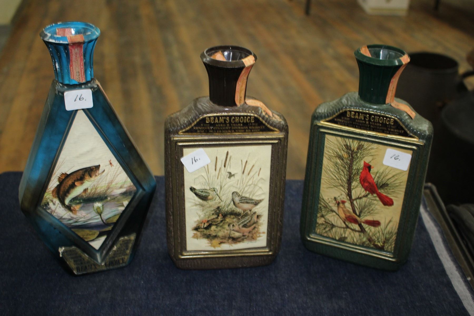 Jim Beam Decanters (3) w/J. Lockhart Decals on them (Cardinal; Woodcock & Large Mouth Bass)