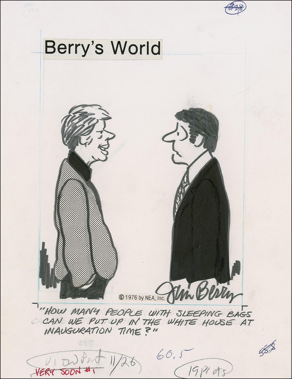 Pulitzer Prize-winning political cartoonist. Original hand-inked one panel political cartoon from 1976 on an off-white 8.5 x 11 sheet. Cartoon depicts Jimmy Carter asking an aide “How many people with sleeping bags can we put up in the White House at inauguration time?” Signed under the image in black artist’s pencil by Berry. In fine condition, with several editorial notations to bottom border. RRAuction COA.