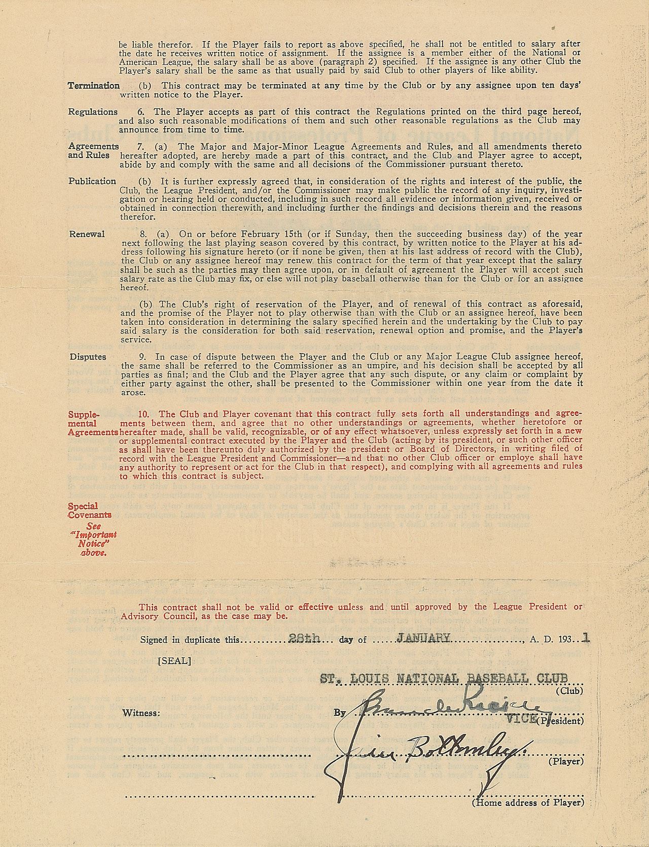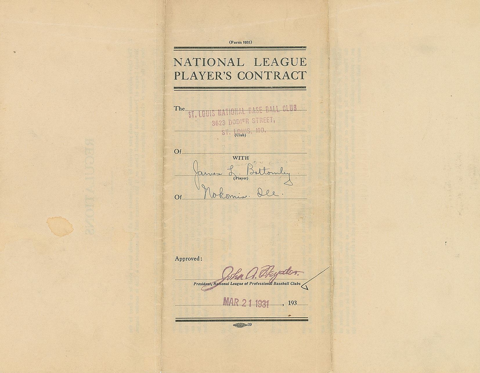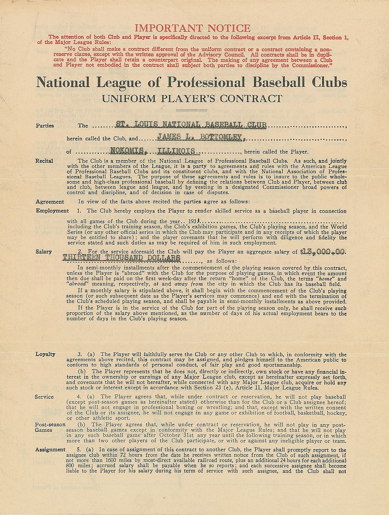Contract, four pages on two adjoining sheets, 8.5 x 11, January 28, 1931. National League uniform player’s contract in which Jim Bottomley agrees to render "skilled service as a baseball player…during the year 1931” for the St. Louis Cardinals, for a salary of $13,000. Signed at the conclusion in fountain pen by Bottomley and countersigned by Cardinals General Manager Branch Rickey. The reverse stamped by National League President John Heydler. In very good to fine condition, with some small edge tears and partial separations to folds. Bottomley's lefty .348 batting average helped send his Cardinals to the World Series, where they beat the A's in seven games to achieve World Champion status.