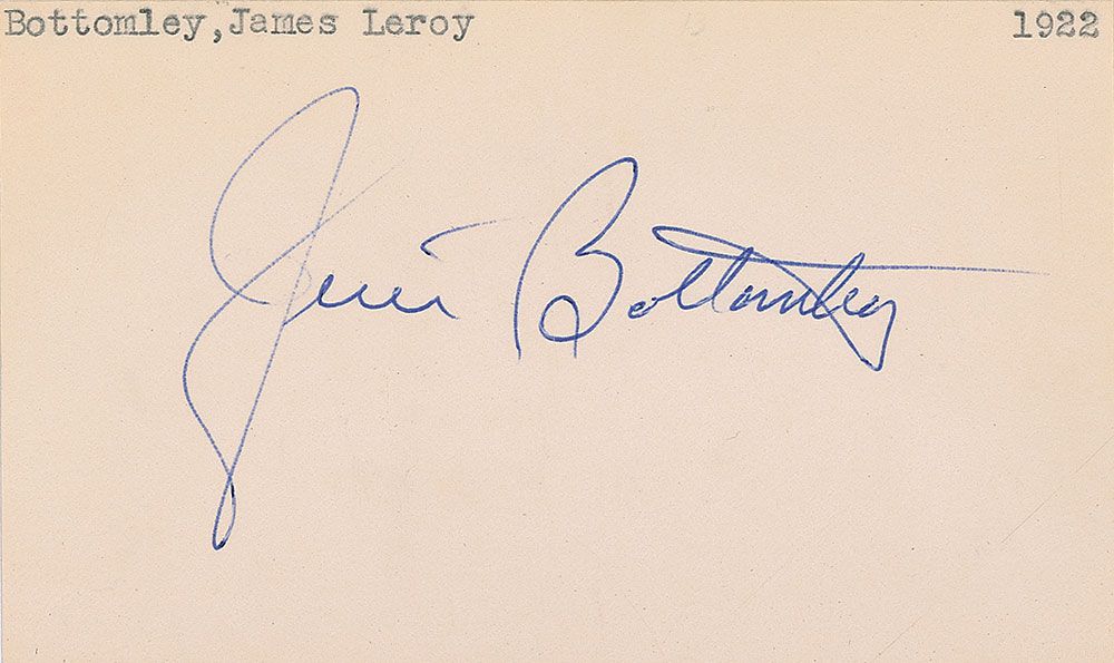 Vintage ballpoint signature, “Jim Bottomley,” on an off-white 5 x 3 card bearing a typed collector’s notation. In fine condition.