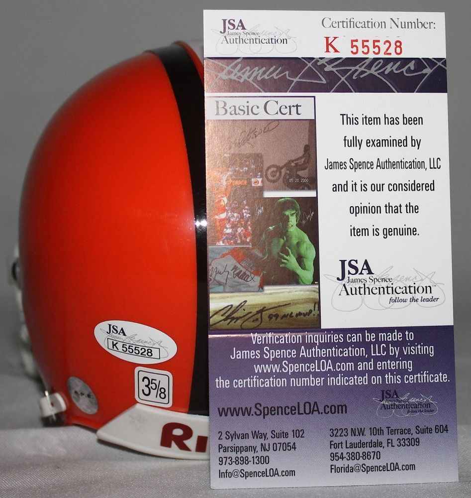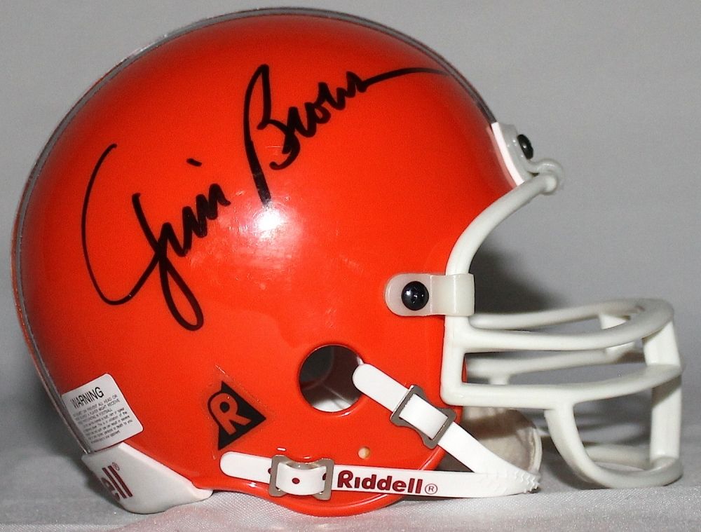Riddell mini helmet hand-signed in black felt tip pen by Jim Brown (Browns HOF). The autograph includes an official James Spence Authentication (JSA) hologram and matching COA for authenticity purposes.