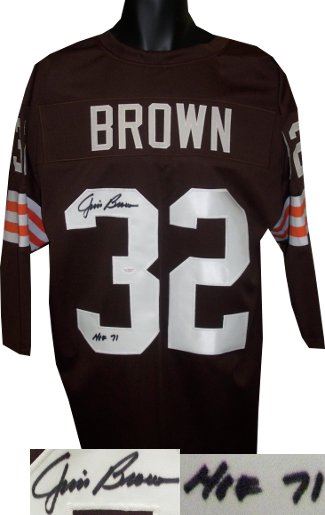 Jim Brown was taken in the first round of the 1956 draft by the Cleveland Browns. He was the first player ever to reach the 100-rushing-touchdowns milestone. Brown holds the record at 5, for total seasons leading the NFL in all-purpose yards. Brown retired far ahead of the second-leading rusher and remains the league's eighth all-time leading rusher, and is still the Cleveland Browns all-time leading rusher and was inducted into the Pro Football Hall of Fame in 1971. Jim Brown has hand autographed this Cleveland Browns Brown Prostyle Jersey with 3/4 Sleeves and with HOF71 inscription. James Spence Hologram and Certificate of Authenticity.