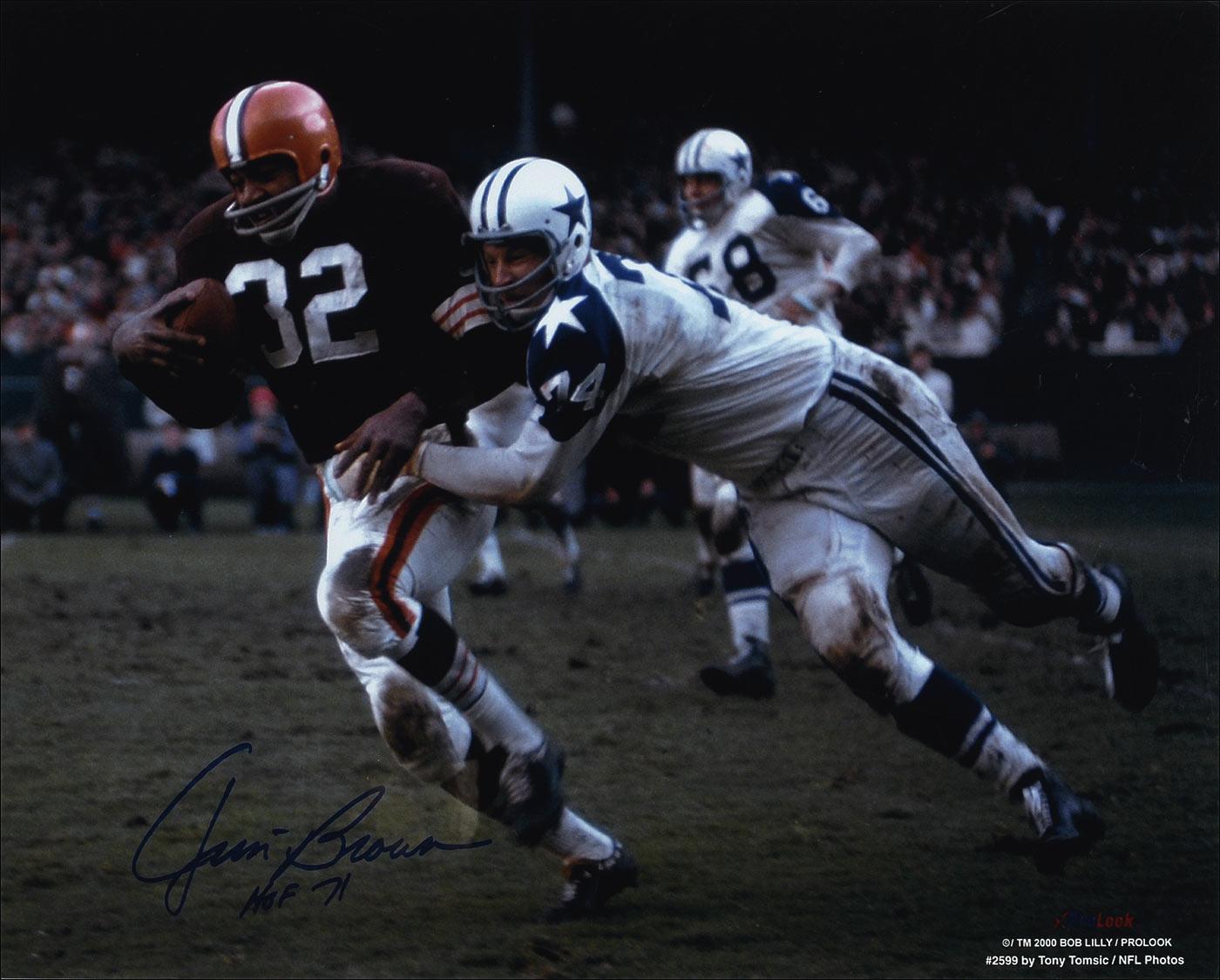 Color glossy 20 x 16 photo of Brown being dragged down by Bob Lilly, signed in blue felt tip, In very fine condition. Pre-certified Steve Grad/PSA/DNA and RRAuction COA.
