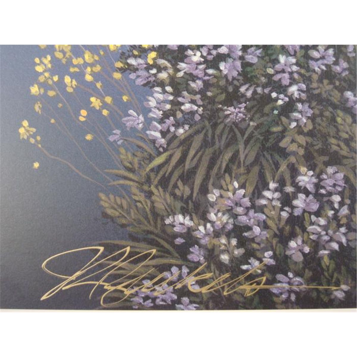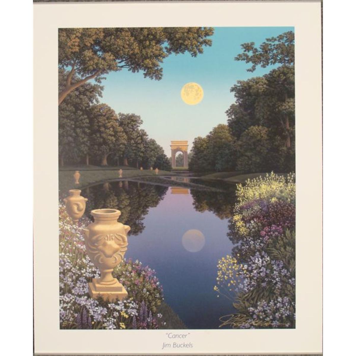 This print is from the Zodiac Suite, portraying the classic figures of the zodiac in lush settings.Artist: Jim Buckels Title: "Cancer" Signature: In gold ink, lower rightMedium: Print on paper Sheet size: 11 x 13 1/2 inches Condition: Excellent * Note: The complete Zodiac Suite consisting of 12 individual prints is also available for $500. Biography * Jim Buckels drew his early inspiration for art from the dreamscapes of Maxfield Parrish, N.C. Wyeth and Henri Rousseau, and later from classic works by Grant Wood and Thomas Hart Benton. His studies led to a BA in art from the University of Northern Iowa. His professional career began as a freelance illustrator, where he became recognized for his stylized landscapes. His technique uses airbrush and acrylic paint to produce smooth colors and details. Both magical and technically astounding, the art of Jim Buckels is admired by fans of fantasy and contemporary art alike. His work can be found in many public and private collections. *