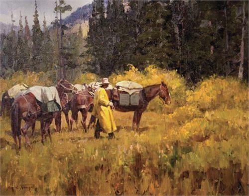 Jim C. Norton (b. 1953). CA. "Hunters Line Camp". 16" x 20". Oil on Board. (est $3,000-4,000)