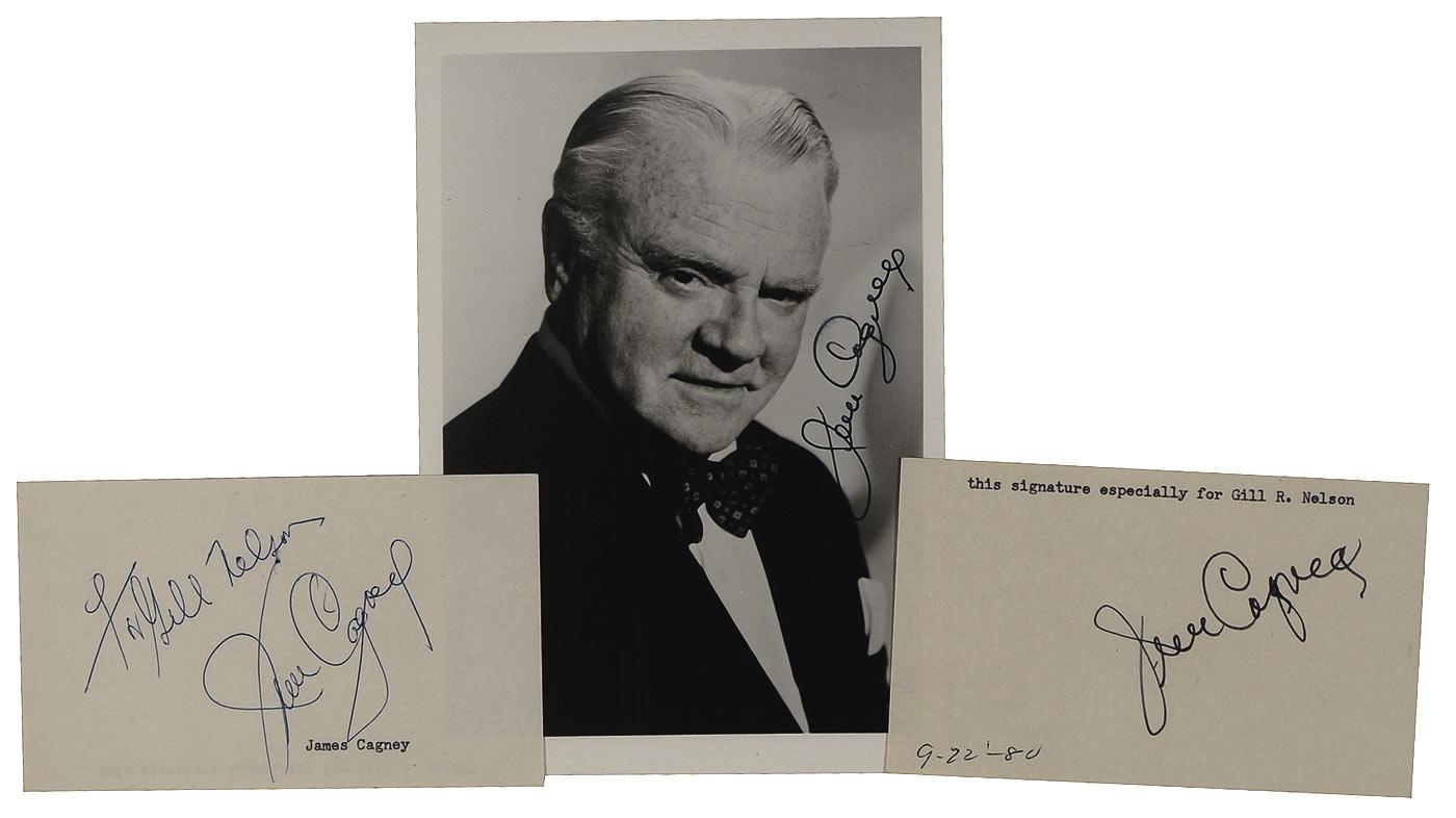 Matte-finish 5 x 7.25 photo of Cagney from late in his career, signed in black felt tip; and an ink and felt tip signature (one inscribed) on individual off-white 5 x 3 cards, with one card having a typed collector’s inscription along top. In fine overall condition.