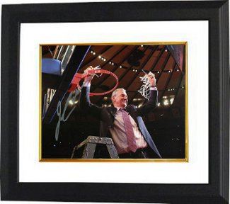 Jim Calhoun is the former head coach of the University of Connecticut's men's basketball team. He announced his retirement on September 13, 2012. His teams have won three national championships (1999, 2004, 2011), played in four Final Fours (most recently in 2011), won the 1988 NIT championship, and have won seven Big East tournament championships (in 1990, 1996, 1998, 1999, 2002, 2004, and 2011). In 2005 he was inducted into the Basketball Hall of Fame. On Feb 25, 2009, Jim Calhoun won his 800th game. On April 4, 2011, Calhoun won his third NCAA Men's Championship. The victory over Butler made Calhoun, at 68, the oldest coach to win an NCAA Division I men's basketball title. Jim Calhoun has hand signed this Connecticut Huskies 16X20 Photo. Leaf Authentics Hologram and Certificate of Authenticity from Athlon Sports. Custom White Mat and Premium Black Frame as shown.