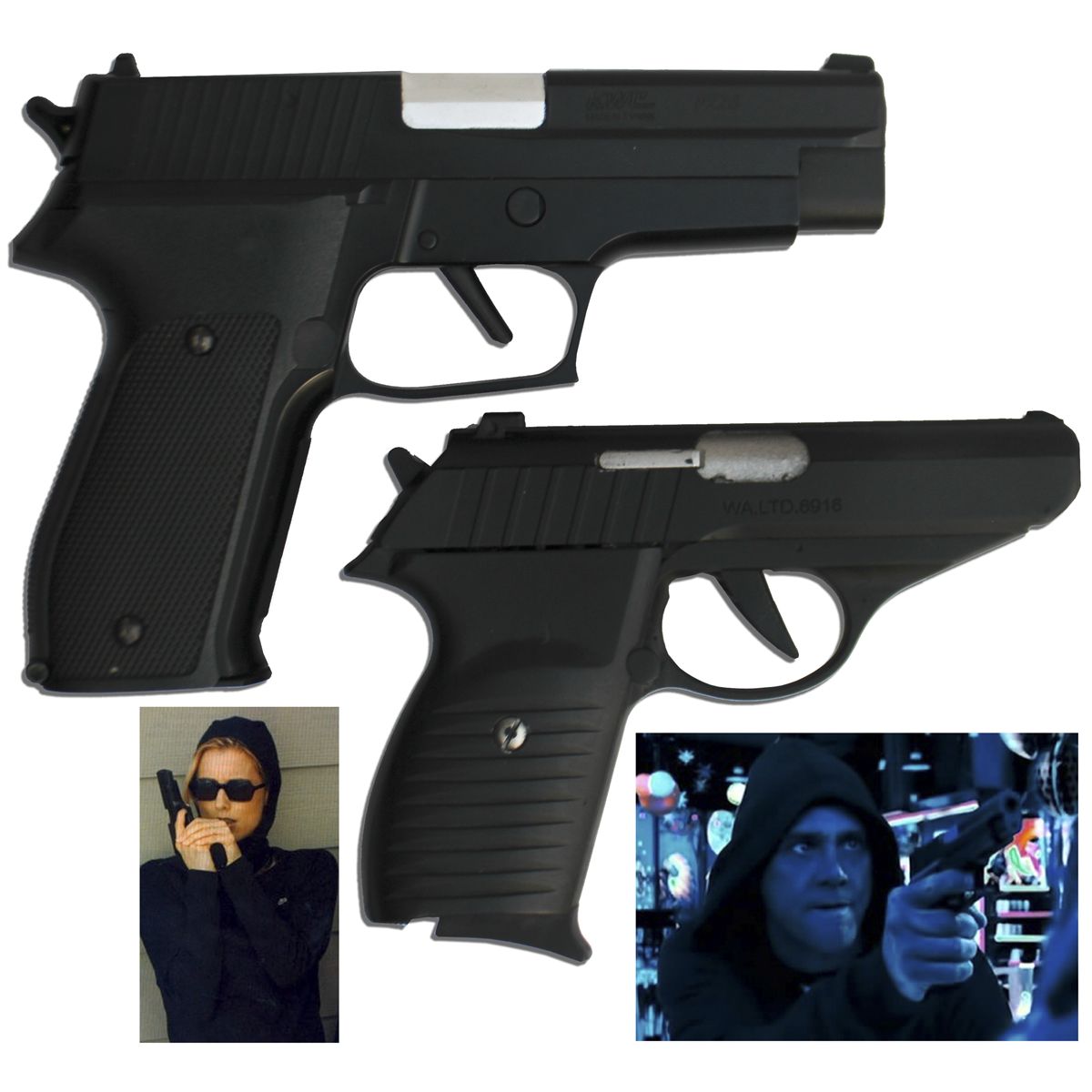 Two prop water guns from the 2005 film, ''Fun With Dick & Jane''. Carrey starred as a man who loses his job and, along with his wife, played by Tea Leoni, becomes a robber. During various robbery scenes, both Carrey and Leoni are seen using the water guns, borrowed from Carrey's son in the film. First gun measures 7.5'' x 5.25''; second gun measures 6.5'' x 4.5''. Both near fine. Includes two Columbia Pictures COAs.