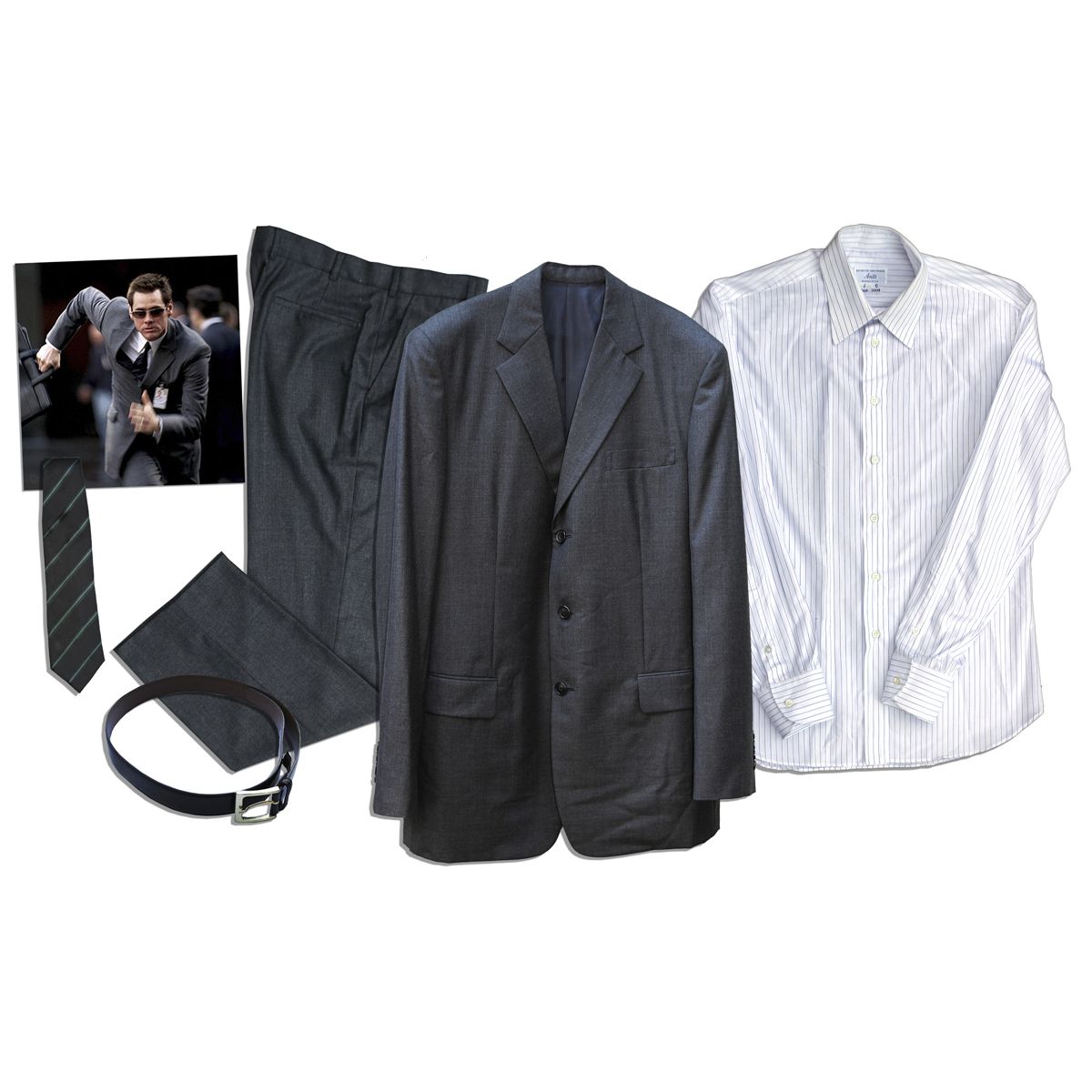 Jim Carrey worn wardrobe from ''Fun With Dick & Jane''. Carrey starred as a man who loses his job and, along with his wife, becomes a robber. Costume includes: (1) a grey ''John David Ridge'' suit. Jacket has no size, though 18'' shoulder-to-shoulder x 37''. Pants 34'' x 43''. (2) A ''Anto Beverly Hills'' brand white shirt with blue pinstripes. Tag has ''J C / Sept. 2004'' stitched beneath it. Also includes a black ''Trafalgar'' brand leather belt with gold buckle and a ''Giorgio Armani'' brand grey striped tie. Original wardrobe tag intact. Fine condition. With a color photocopy of the COA from Columbia Pictures.
