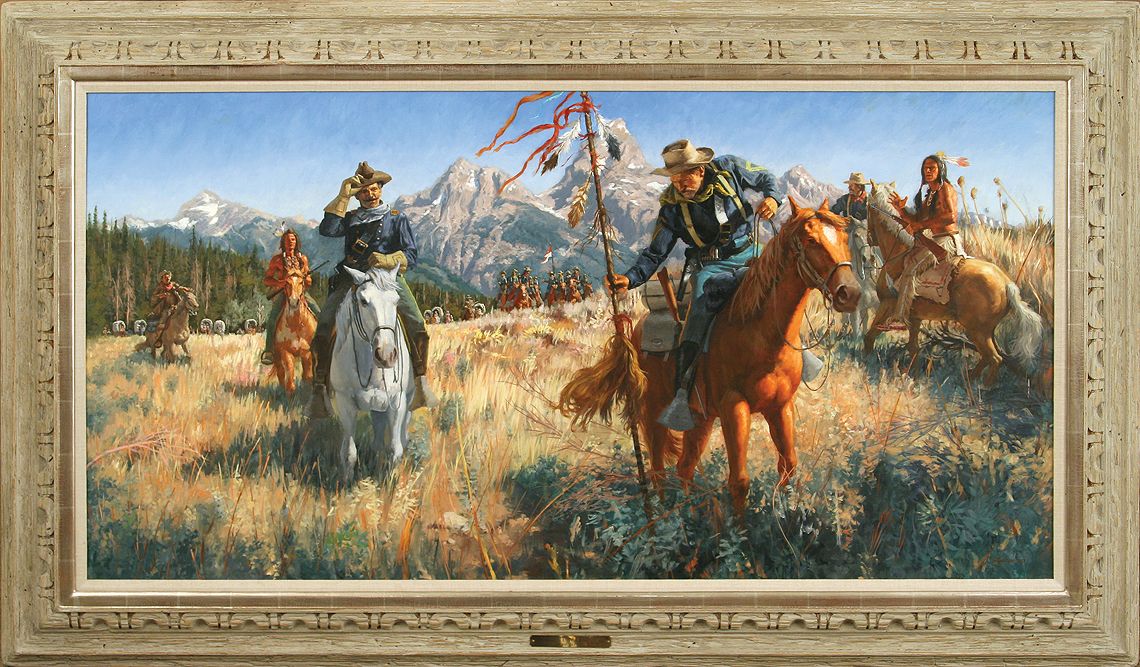 Jim Carson (b. 1942) CA. Silent Warning. 30" x 60" oil on canvas. Signed lower right: © Carson 1987. (est. $8,000-12,000). Provenance: The S. George & Helen Binson Estate, donated to the Cheyenne Frontier Days Old West Museum (Cheyenne, WY).. CONDITION REPORTS: www.auctioninsantafe.com/docs/cr2012.pdf