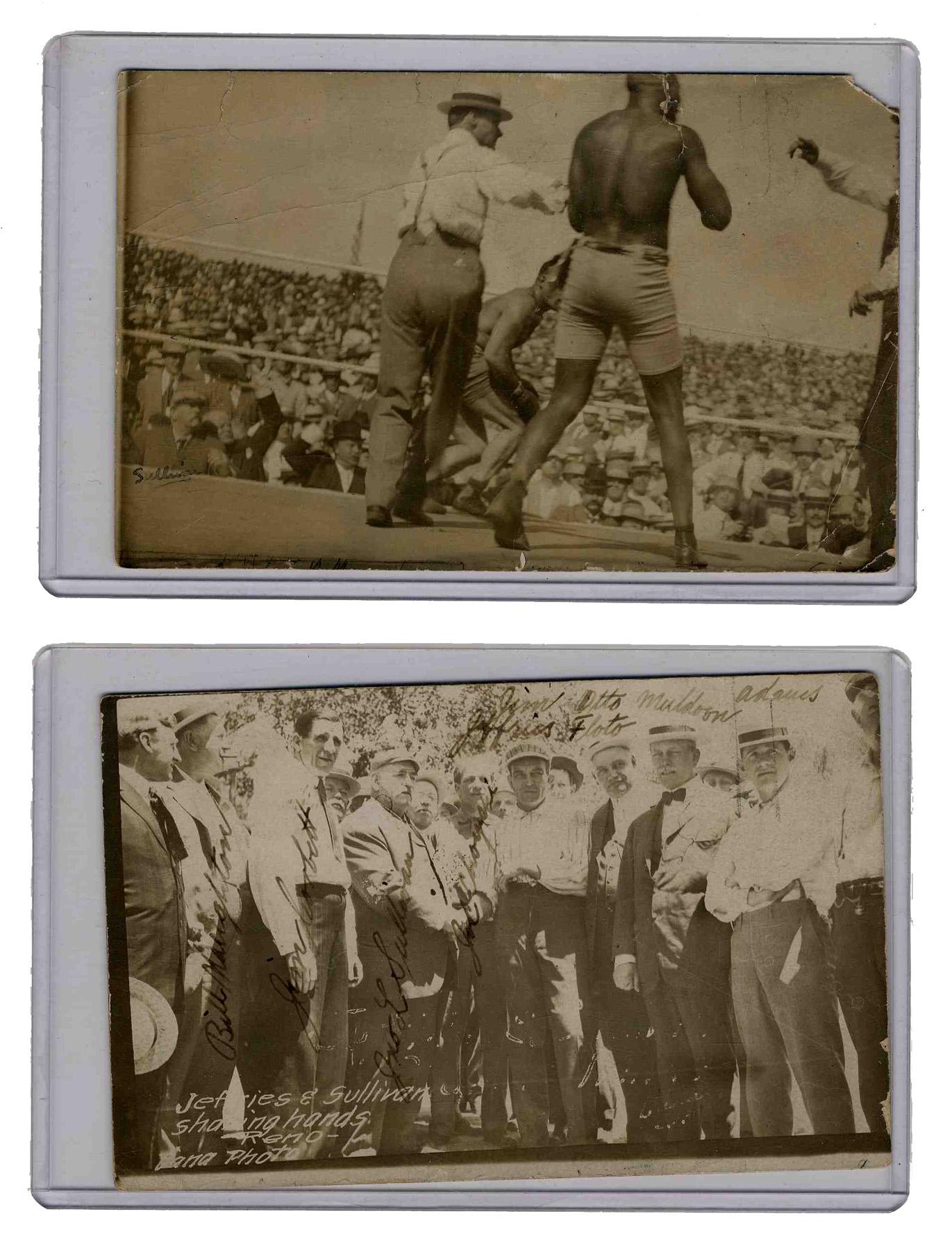 Jim Corbett signed photo from the 1910 ''Fight of the Century'' between Jack Johnson and James Jeffries, with an additional photo of Johnson and Jeffries in the ring. In the signed photo, Corbett writes the names of the men in the photo, including Bill Naughton, Jim Jeffries, and others. Second photo, depicting Johnson and Jeffries in the ring, measures 5.25'' x 3.5'' with minor creasing, a small rip to top left and a small chip to top right corner. Signed photo, measuring 5.25'' x 3.5'' has minor creasing to corners. Both very good.
