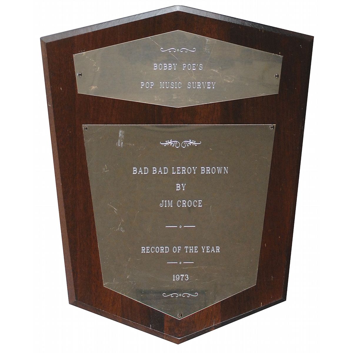 An record of the year award presented to Jim Croce by Bobby Poe’s Pop Music Survey for his 1973 song ‘Bad, Bad Leroy Brown.’ Six-sided award measures 10 x 14. In very good condition, with scattered scratches and surface marks. Poe produced several musical tip sheets starting in 1968, with the Pop Music Survey being his most successful and running until the 1990s.