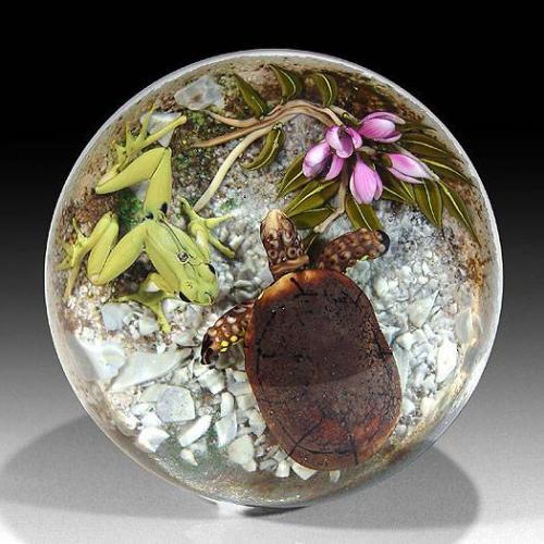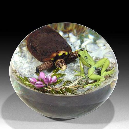 Jim D'Onofrio 2000 turtle and frog paperweight. The piece contains a brown mud turtle and a green frog, near a vine bearing mauve flowers and green leaves, on gray pebbly ground. Signed/dated. Diameter 3 3/8".