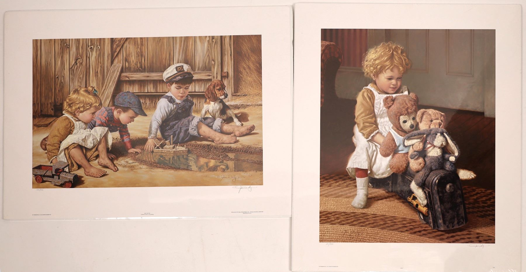 This lot has two signed art prints by Jim Daly: "All Aboard" depicts a little girl aboard a train engine with her three furry friends numbered 201/950, 20 x 24 inches; "Mud Mates" depicts three children and a puppy playing mud puddle navy, numbered 612/950. c1994. 19 x 25 inches. Please see photos for details.