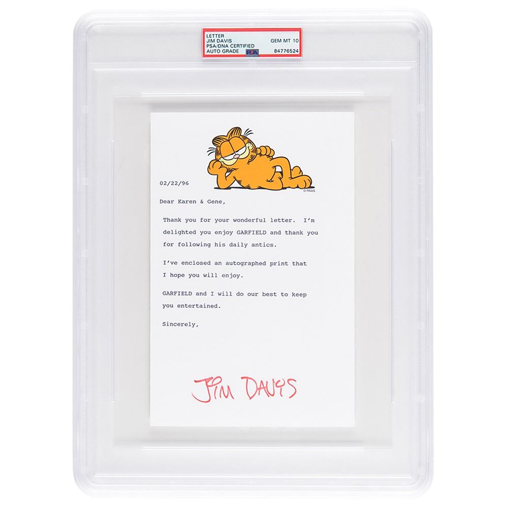 TLS, one page, 5.5 x 8.5, illustrated Garfield letterhead, February 22, 1996. Letter to "Karen & amp; Gene," in part: "Thank you for your wonderful letter. I& #39;m delighted you enjoy Garfield and thank you for following his daily antics…Garfield and I will do our best to keep you entertained." In very fine condition. Encapsulated and graded by PSA/DNA as "GEM MT 10."