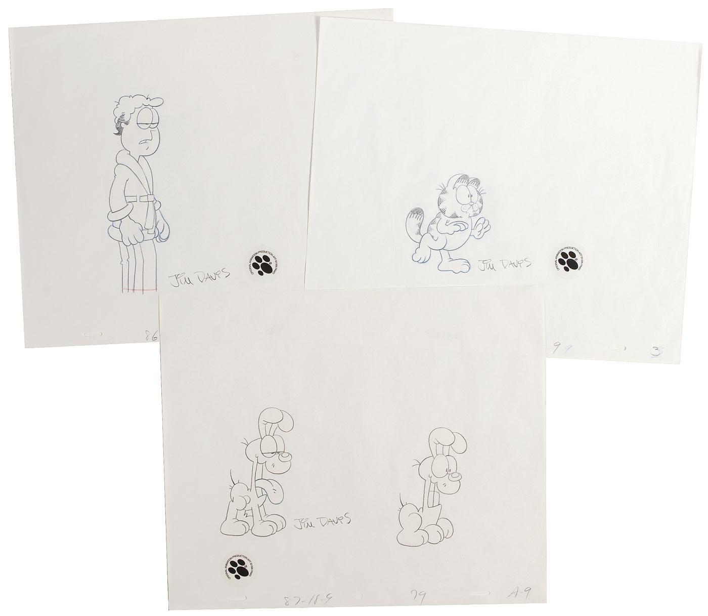 Three original pencil production sketches from Garfield, 12.5 x 10.5, each signed by Davis in pencil, one each of Garfield, Jon, and Odie (which has two sketches). In fine condition, with usual animators’ markings and notations and expected light handling wear.