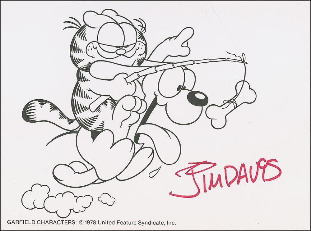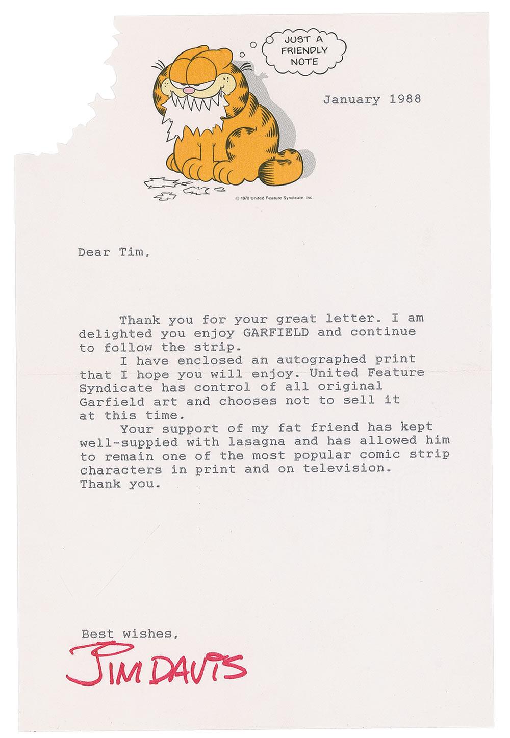 Two items: TLS, signed “Jim Davis,” one page, 5.75 x 8.75, uniquely designed Garfield letterhead (with a ‘bite mark’ taken out of the top left corner), January 1988. Letter of thanks to a fan. In part: “Your support of my fat friend has kept [him] well-supplied with lasagna and has allowed him to remain one of the most popular comic strip characters in print and on television.”; and a 6.25 x 4.75 printed sketch of Garfield riding Odie, signed in red felt tip, “Jim Davis.” In fine condition. Accompanied by the original mailing envelope.